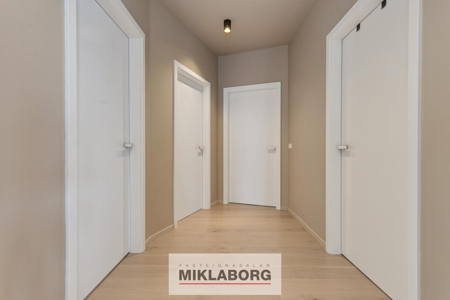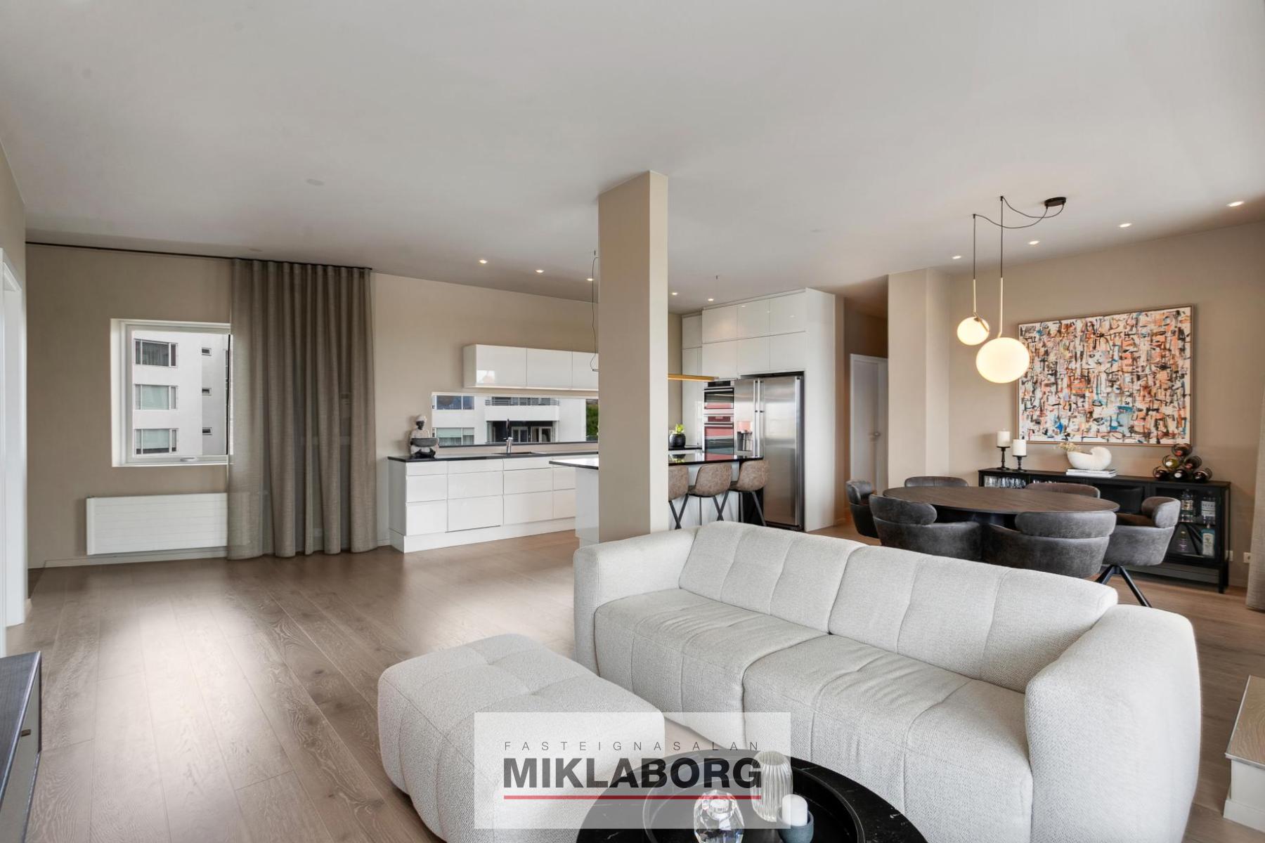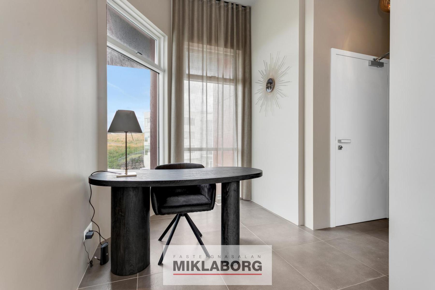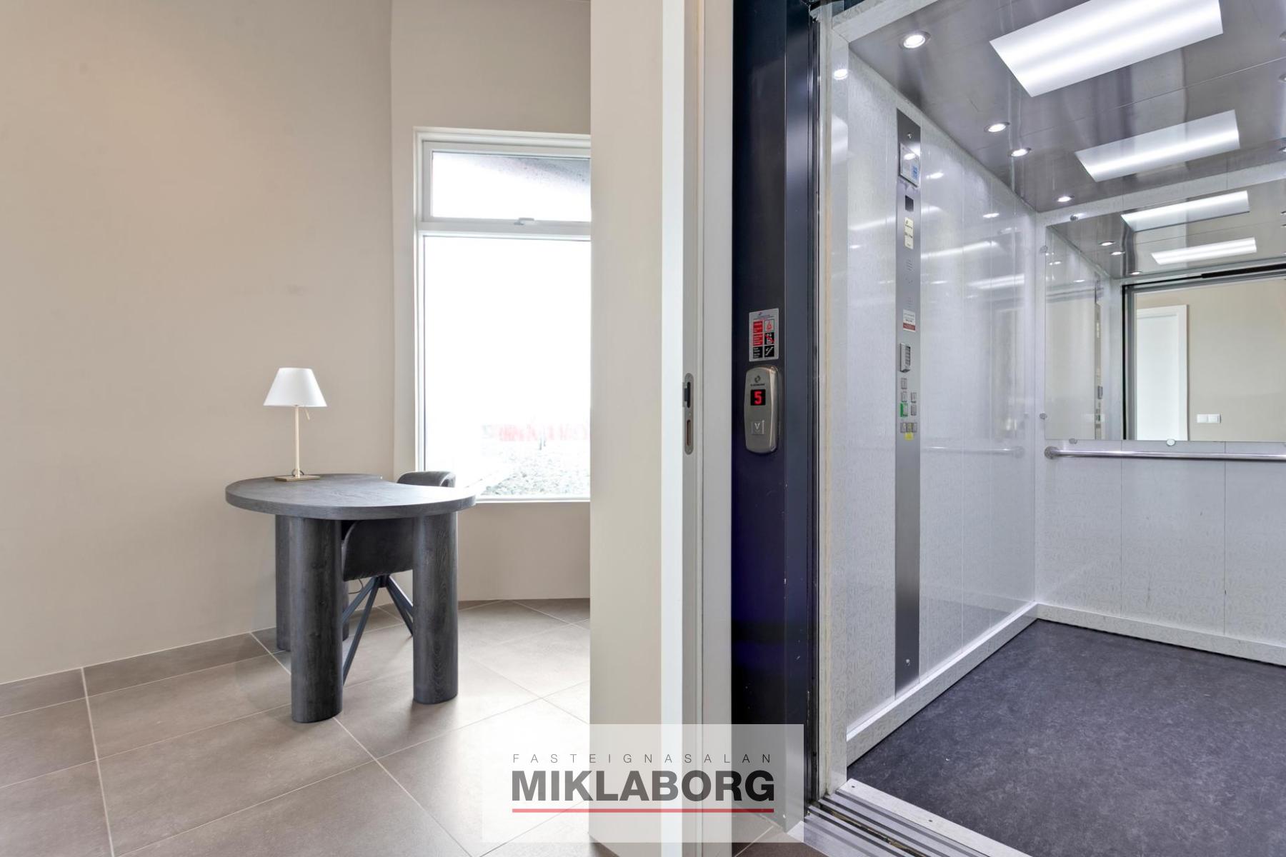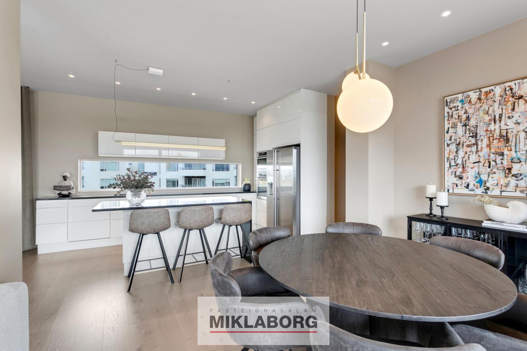 Lyfta opnast beint inn í íbúðina. Tvennar svalir, aðrar um 30 fermetrar að stærð með viðarklæddu gólfi, heitum potti og glerhandriði á stálprófílum og hinar um 40 fermetrar að stærð einnig með viðarklæddu gólfi og glerhandiriði á stálprófílum. Tvö sér bílastæði í lokuðum bílakjallara fylgja eigninni og sérgeymsla á jarðhæð er 12,8 fermetrar að stærð. Innréttingar eru frá HTH, gólfefni eru öll frá Birgisson og eldhús- og baðtæki eru vandaðrar gerðar, innihurðir frá Birgisson eru í yfirhæð og lofthæð íbúðarinnar er yfir 3,0 metrar. Gólfsíðir gluggar eru á stórum hluta íbúðarinnar, tvennar stórar svalir, þar af aðrar með heitum potti og útsýni frá eigninni er algjörlega einstakt.