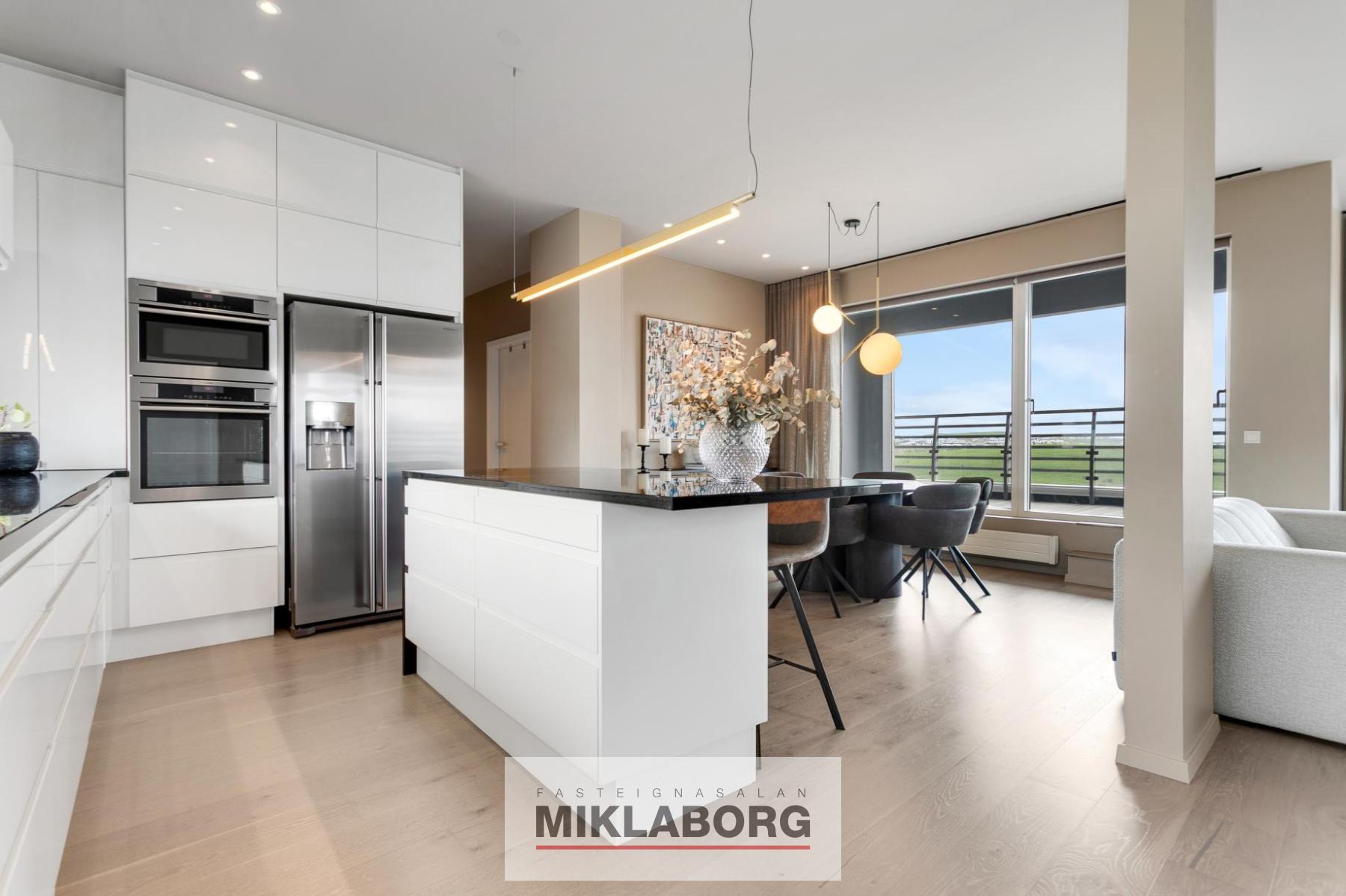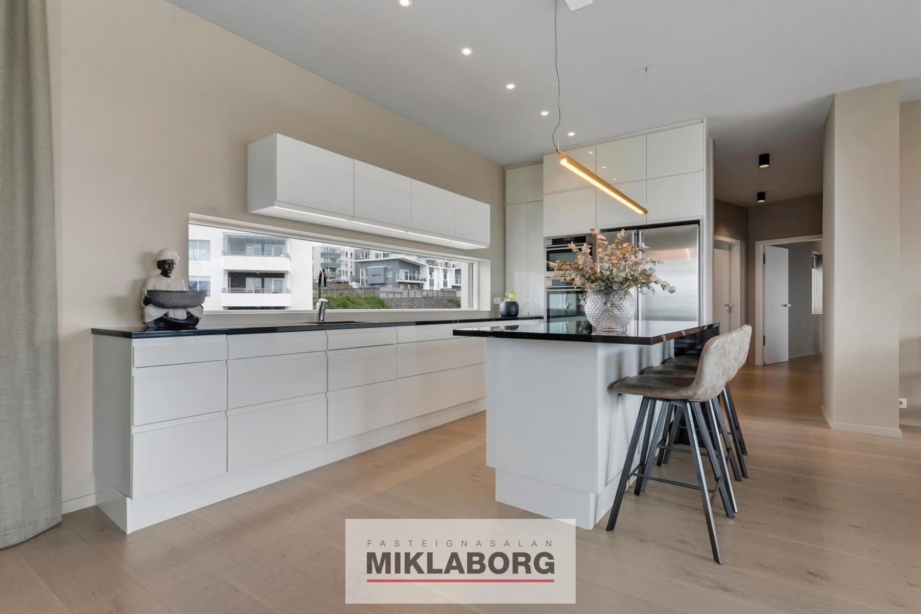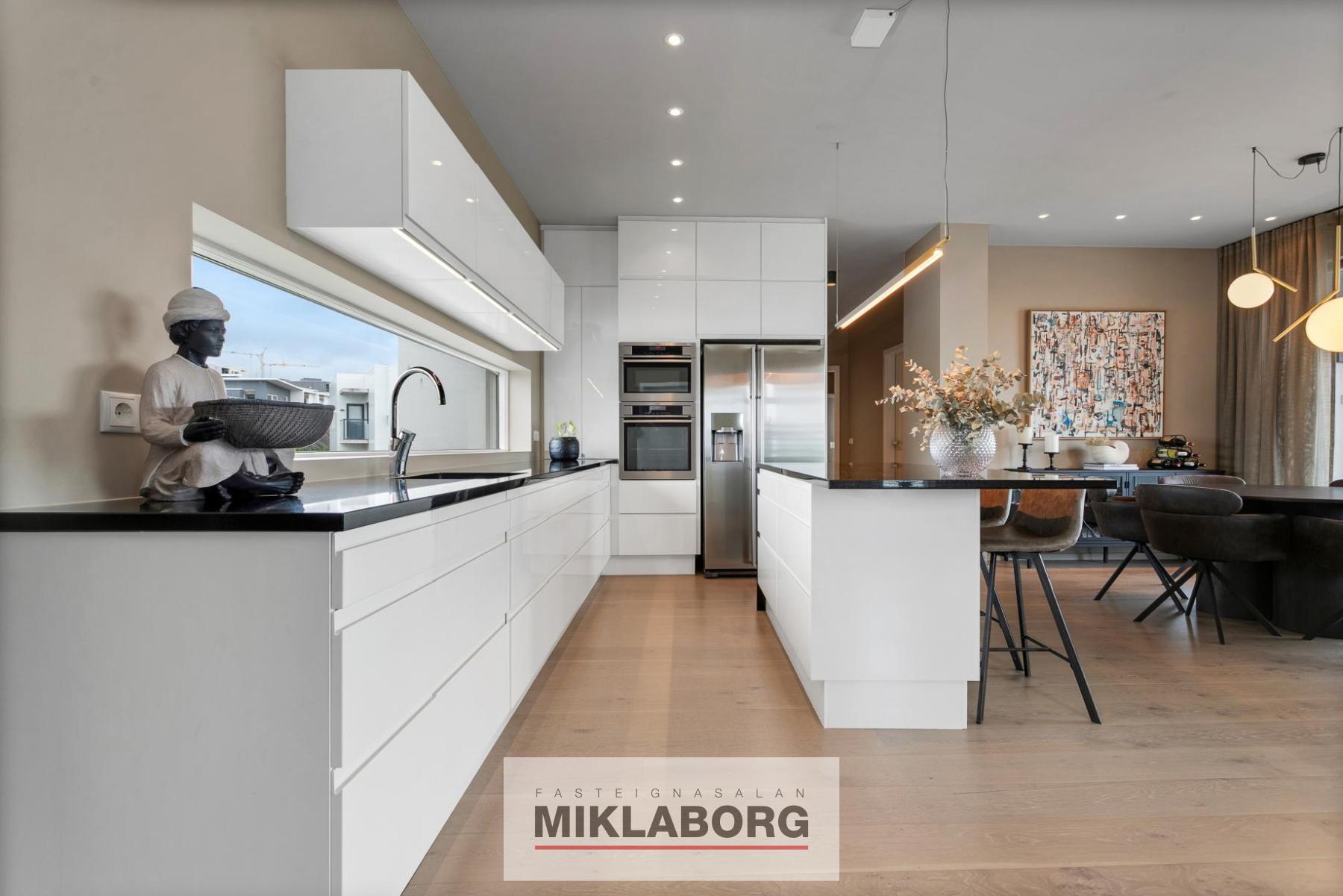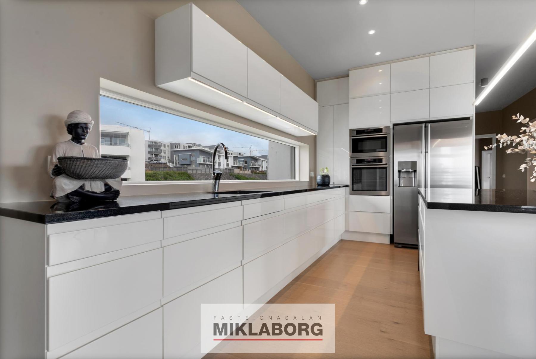 Eldhús: opið við stofu, parketlagt og með gluggum. Hvítar sprautulakkaðar HTH innréttingar með graníti á borðum, miklu skápaplássi, tveimur AEG ofnum, innbyggðri uppþvottavél og tvöföldum ísskáp með klakavél. Eyja með graníti á borði, spanhelluborði. Borðaðstaða er við eyju.