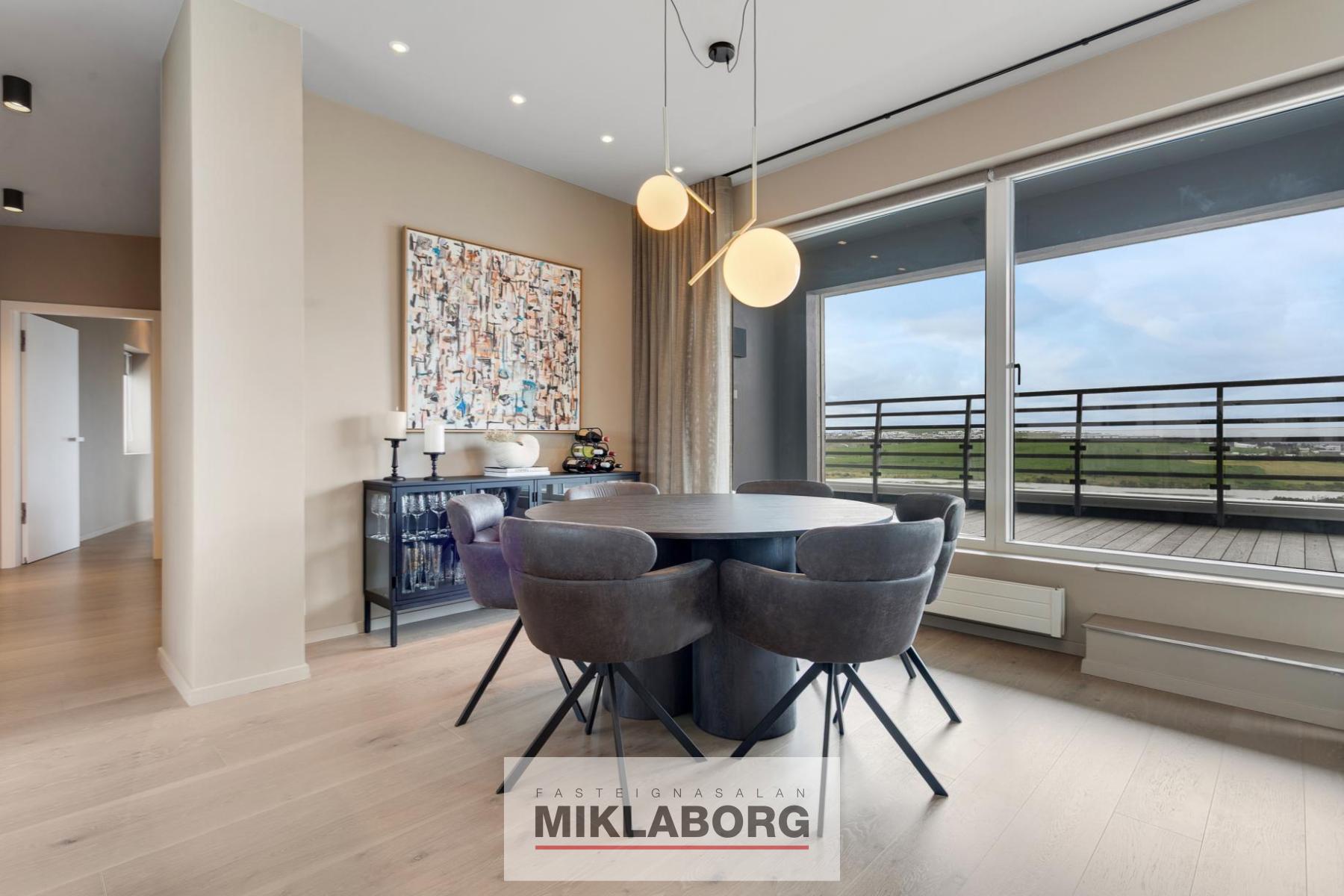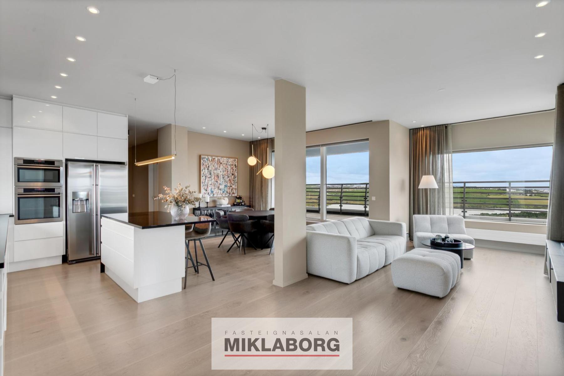 Miklaborg kynnir í einkasölu einstaklega glæsilega "penthouseíbúð'' við Holtsveg 25 í Urriðaholti í Garðabæ. Um er að ræða 181,8 fm , bjarta og rúmgóða 5 herbergja íbúð á efstu hæð með stórglæsilegu útsýni og gluggum í allar áttir. Íbúðin er sú eina á hæðinni og nýtur því fullkomins næðis, lyftan veitir beinan aðgang inn í íbúðina sem tryggir einstakan lúxus og þægindi. Eignin samanstendur af stórglæsilegu alrými með stofu og eldhúsi í opnu og björtu skipulagi, þremur svefnherbergjum, tveimur baðherbergjum, þvottaherbergi og rúmgóðri forstofu. Með íbúðinni fylgja tvö bílastæði í lokuðum bílakjallara. Innanhúshönnun og lýsing íbúðarinnar er eftir Rut Káradóttur innanhúsarkítekt.