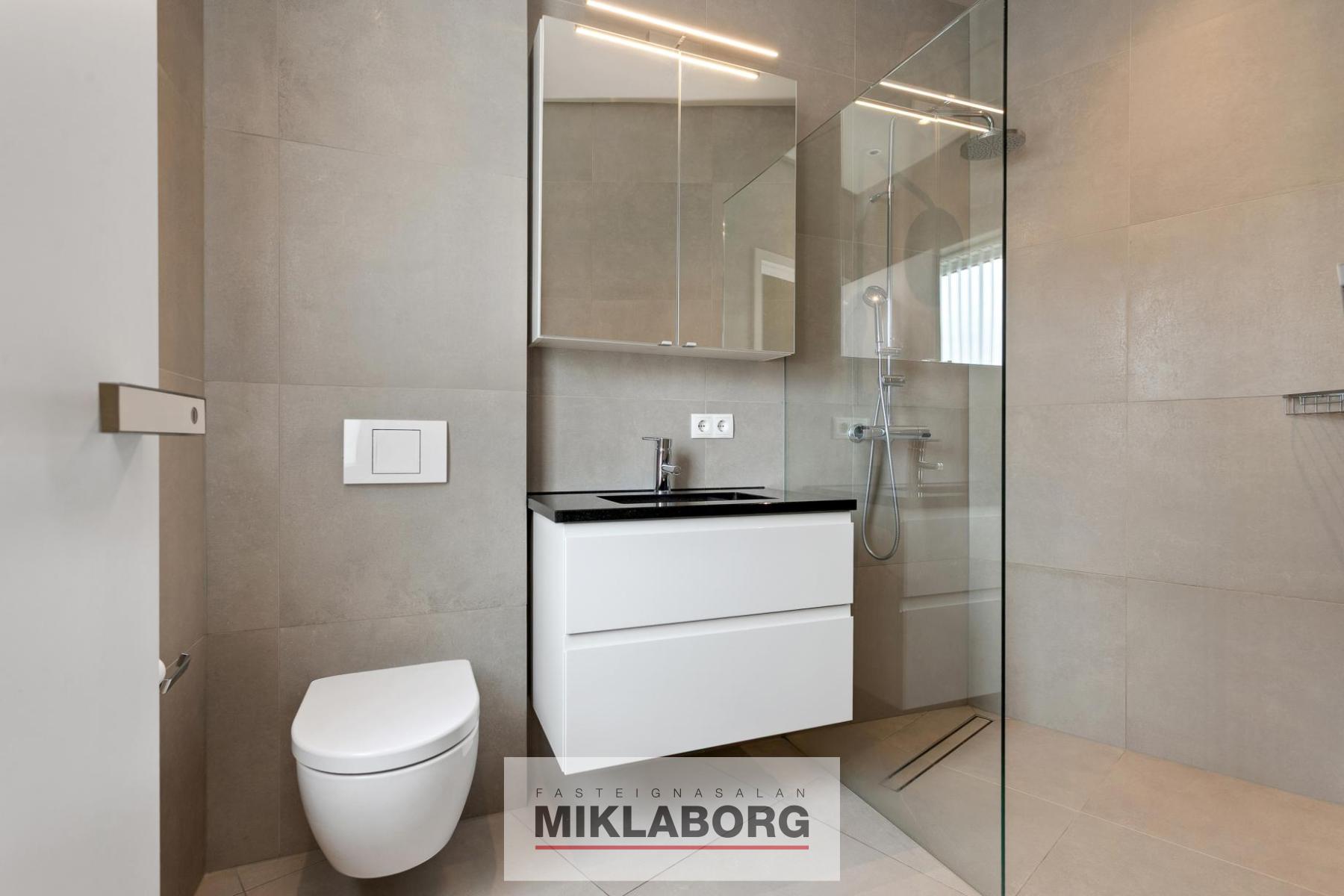 Baðherbergi I: stórt og með tveimur gluggum, flísalagt gólf og veggir, innrétting með graníti á borði, vegghengt wc og flísalögð sturta með sturtugleri.