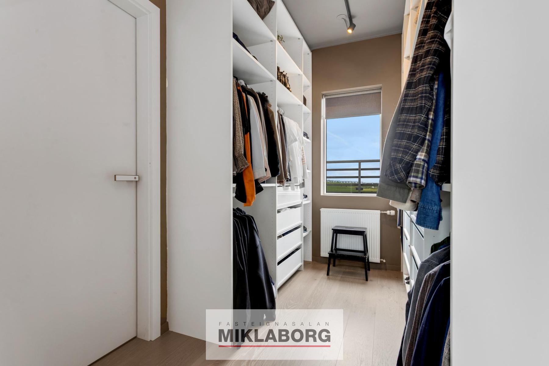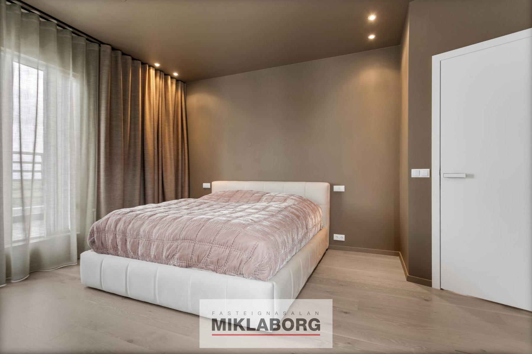 Hjónaherbergi: stóru, parketlögðu með útgengi á stórar svalir til suðurs, vesturs og norðurs og með gluggum í tvær áttir.
