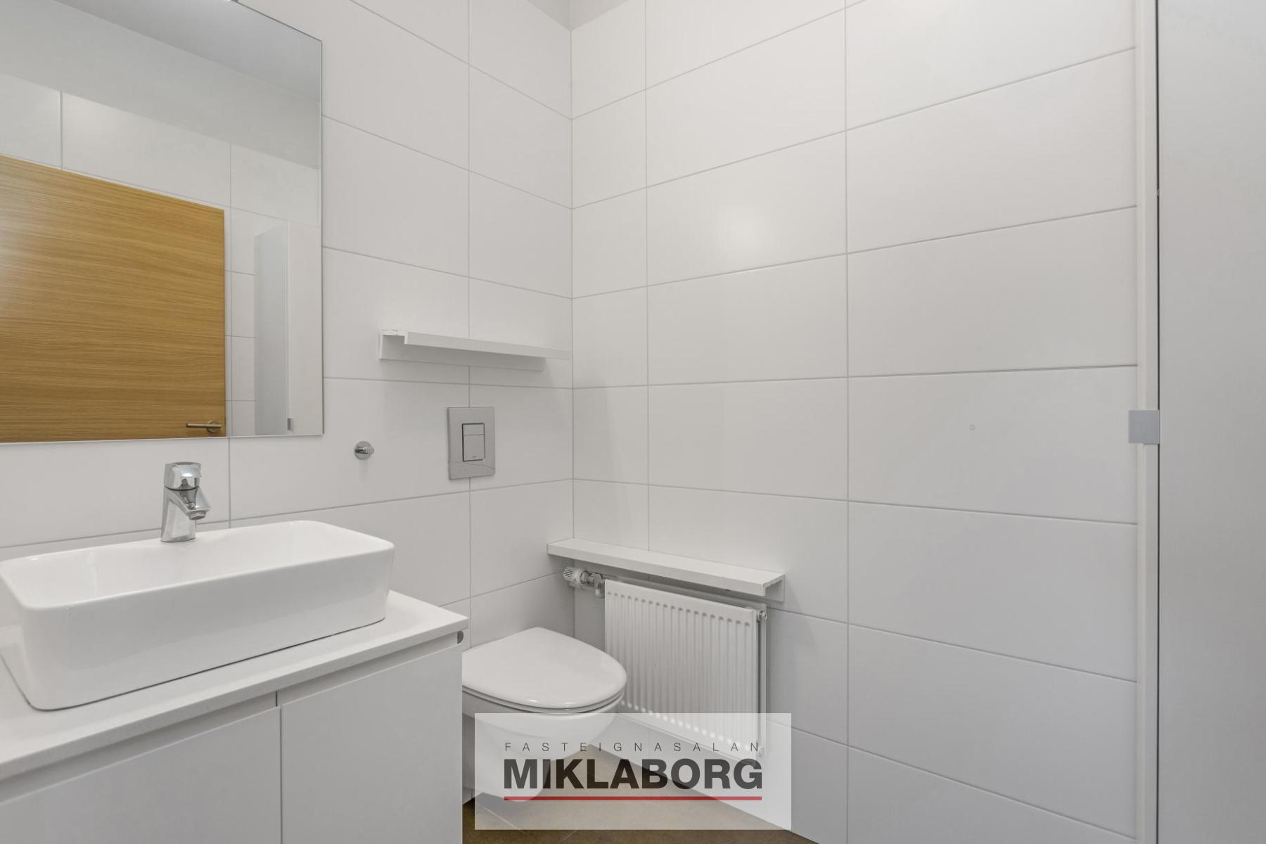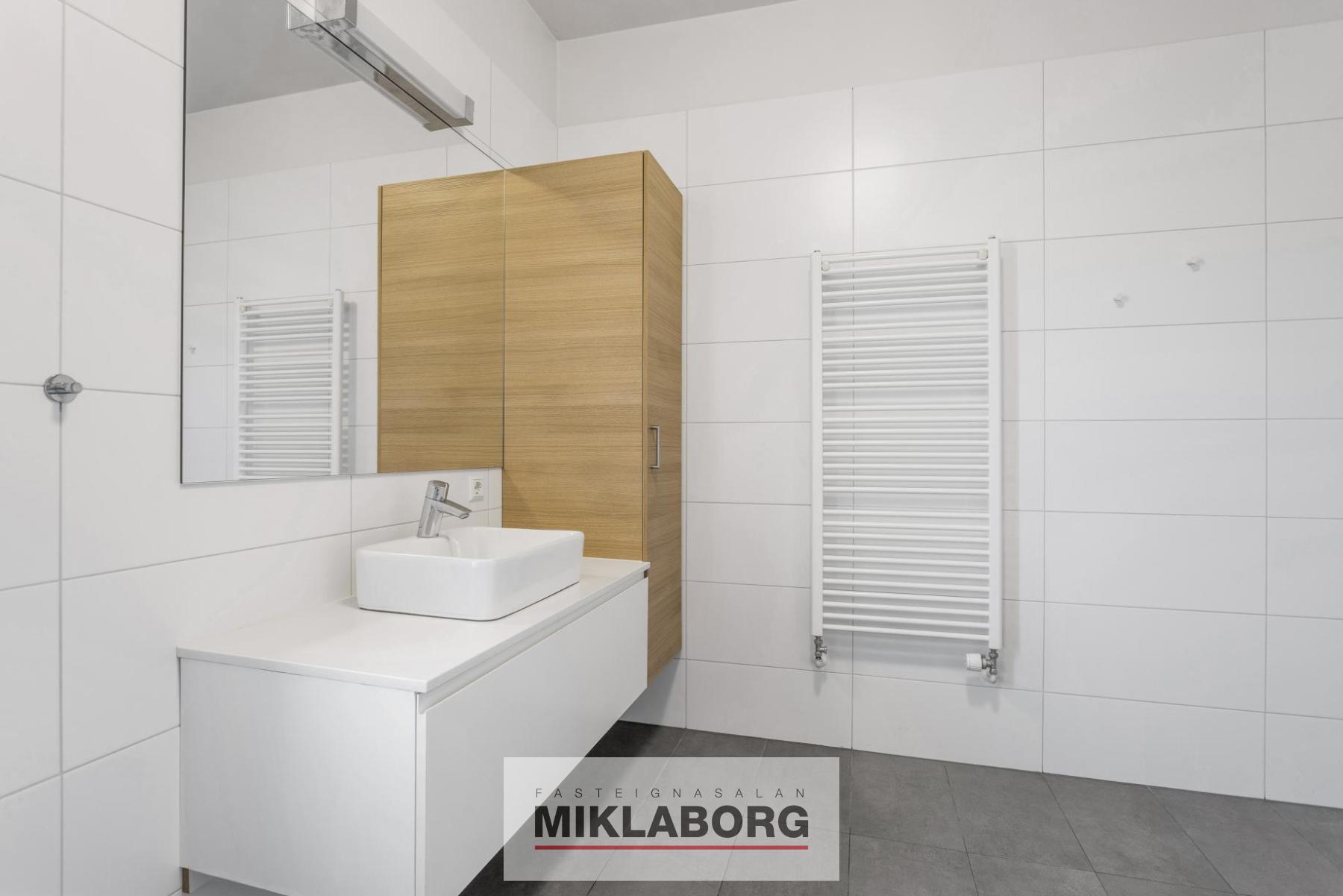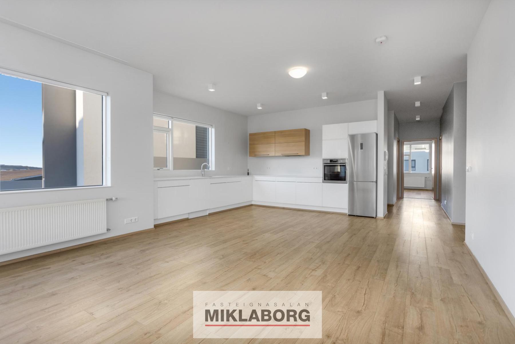 Komið er inn í forstofu með flísum á gólfi og góðum fataskáp. Eldhús og stofa eru í góðu opnu alrými með gluggum til suðurs og austurs og útgengi á 24 fm svalir. Eldhús með hvítri innréttingu og eikar lituðum efriskápum og ljósgráum stein á borðum, Ofni í vinnu hæð helluborði og viftu, innbyggðri uppþvottavél og plássi fyrir ísskáp. Hjónaherbergi er með góðum fataskáp og gluggum á tvo vegu. Barnaherbergin eru tvö, bæði mjög rúmgóð með fataskáp. Gestasalerni er með flísum á gólfi og veggjum, upphengdu salerni, innréttingu með vask og góðum skáp. Baðherbergi með flísum á gólfi og veggjum, baðkari með sturtu aðstöðu, handklæðaofni, upphengdu salerni, hvítri innréttingu með skúffum, góðum hilluskáp og spegli. Sér þvottahús er innan íbúðar með flísum á gólfi og hvítum skáp. Sér geymsla (16,8 fm) er á 1 hæð. Sér stæði merkt B04 er í bílakjallara þar sem einnig er sameiginleg dekkjageymsla. hjóla og vagnageymsla er á jarðhæð.