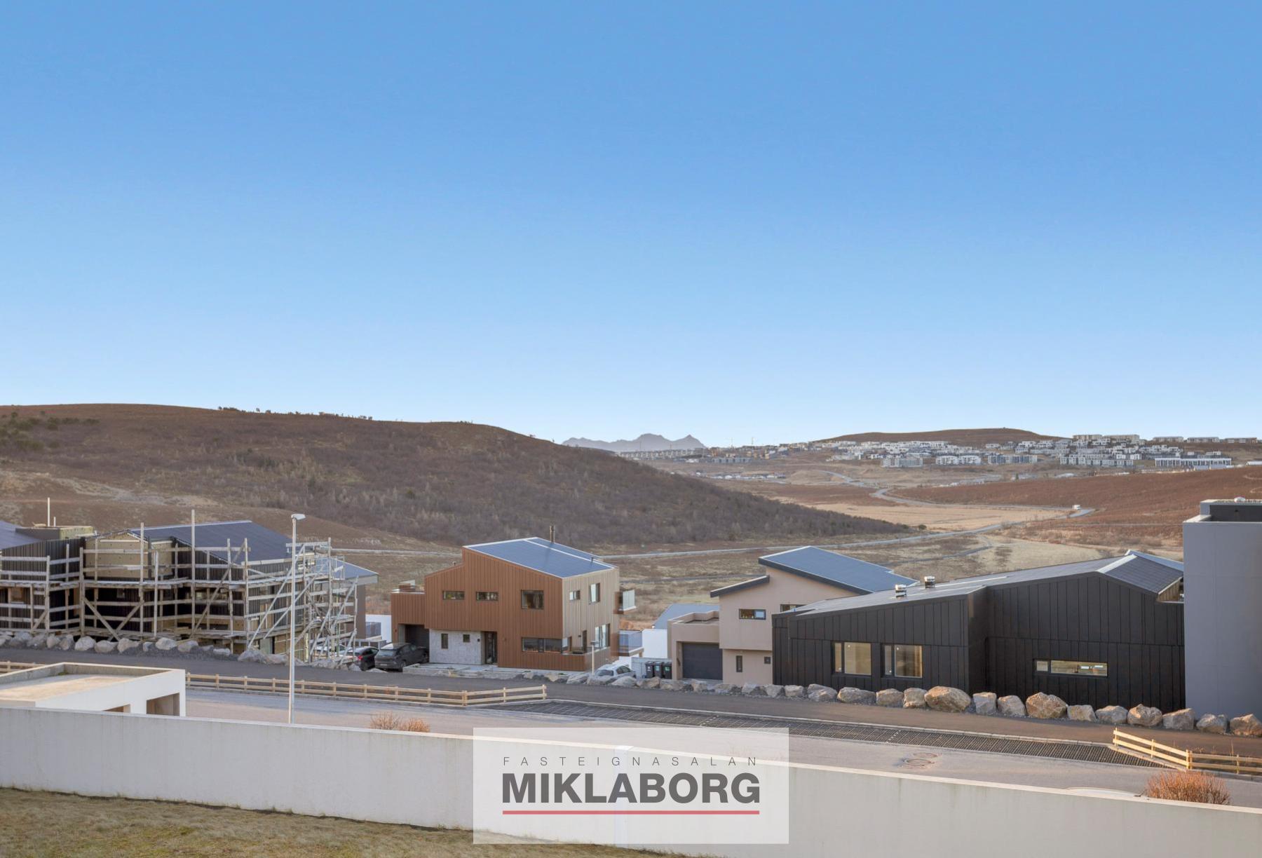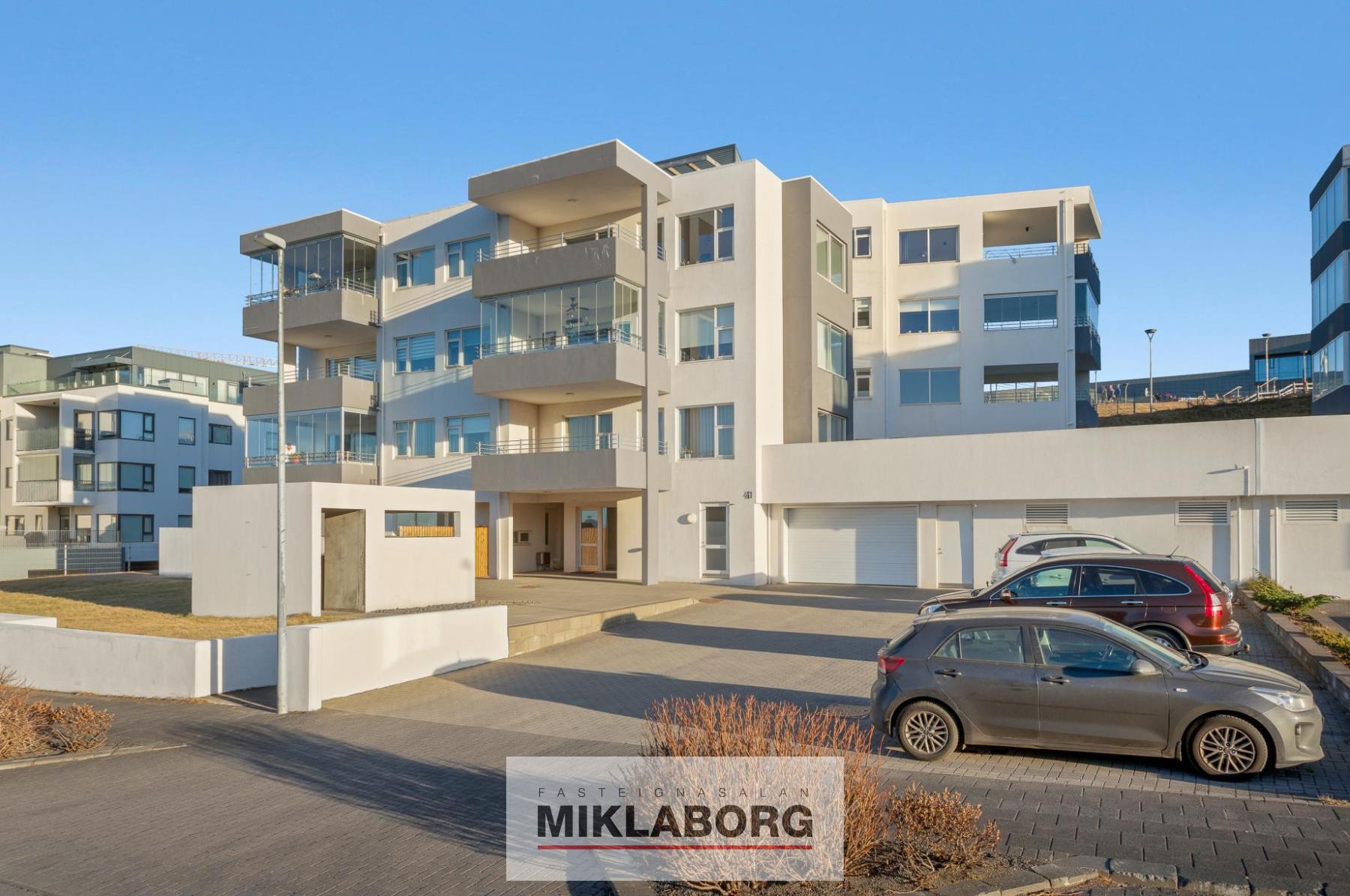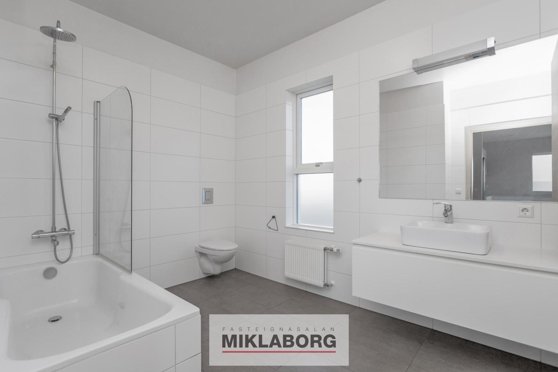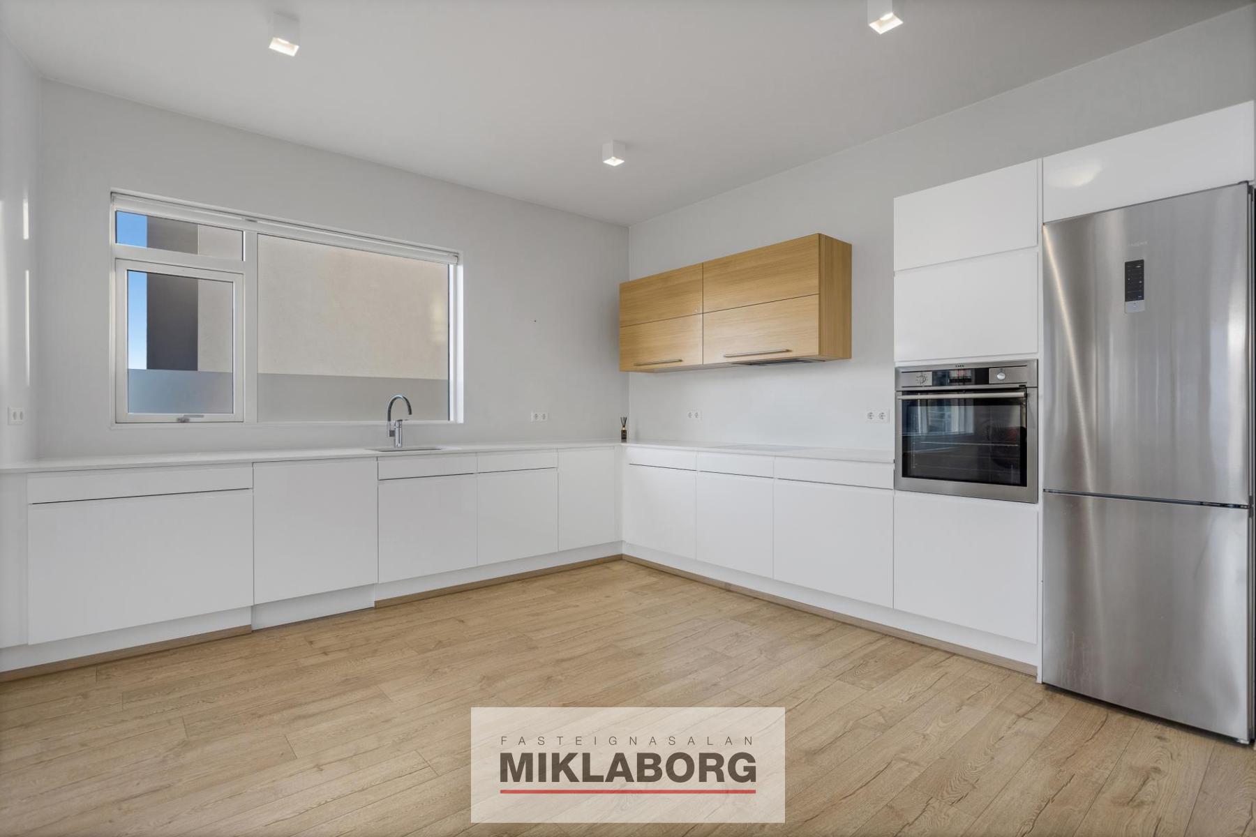 Komið er inn í forstofu með flísum á gólfi og góðum fataskáp. Eldhús og stofa eru í góðu opnu alrými með gluggum til suðurs og austurs og útgengi á 24 fm svalir. Eldhús með hvítri innréttingu og eikar lituðum efriskápum og ljósgráum stein á borðum, Ofni í vinnu hæð helluborði og viftu, innbyggðri uppþvottavél og plássi fyrir ísskáp. Hjónaherbergi er með góðum fataskáp og gluggum á tvo vegu. Barnaherbergin eru tvö, bæði mjög rúmgóð með fataskáp. Gestasalerni er með flísum á gólfi og veggjum, upphengdu salerni, innréttingu með vask og góðum skáp. Baðherbergi með flísum á gólfi og veggjum, baðkari með sturtu aðstöðu, handklæðaofni, upphengdu salerni, hvítri innréttingu með skúffum, góðum hilluskáp og spegli. Sér þvottahús er innan íbúðar með flísum á gólfi og hvítum skáp. Sér geymsla (16,8 fm) er á 1 hæð. Sér stæði merkt B04 er í bílakjallara þar sem einnig er sameiginleg dekkjageymsla. hjóla og vagnageymsla er á jarðhæð.