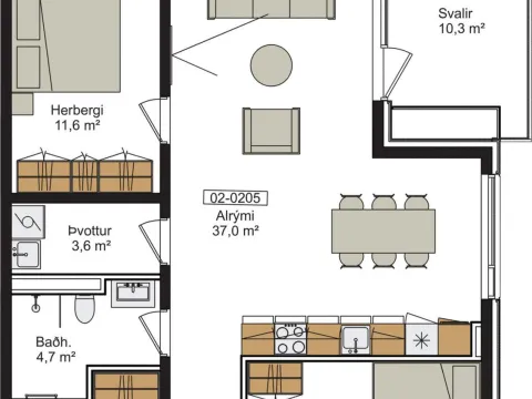 Íbúð 205 er vel skipulögð 3ja herbergja 90,4 fm íbúð á 2. hæð. Eigninni fylgir stæði merkt B29 í bílakjallara.