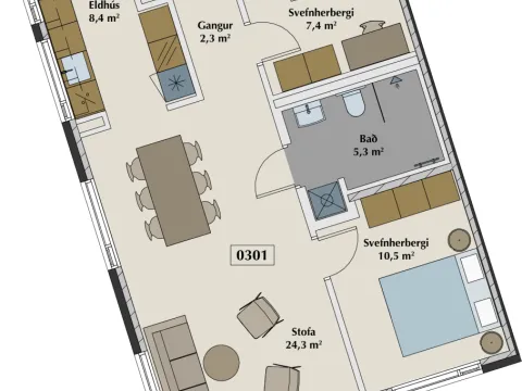 - Innréttingar frá VOKE3 og tæki frá Electrolux. Hágæða baðherbergi eru forframleidd og koma frá Green Box í Danmörku.