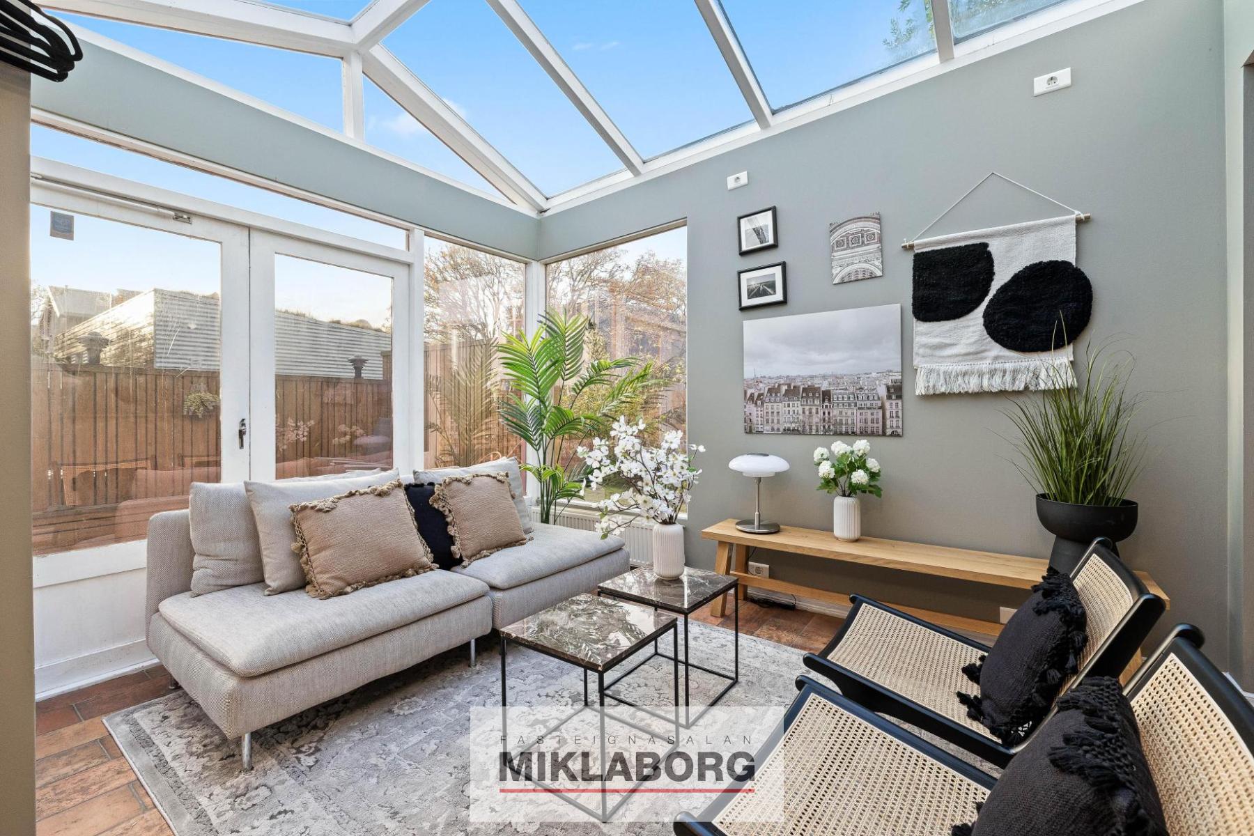 Nánari lýsing: Á jarðhæðinni er forstofa, forstofuherbergi, sólskáli, gestasalerni, þvottahús, sjónvarpsherbergi, stórt eldhús, stofa og borðstofa. Hluti af því fyrrnefnda var breytt í móttökurými frá því að eignin var með gistirekstur en slíkt leyfi fylgir ekki með eigninni. Á annarri hæð eru þrjú herbergi og nýlega endurnýjað baðherbergi með hornbaðkari og sturtu. Útgengt út á þaksvalir bæði úr baðherbergi og einu svefnherbergjanna. Í kjallara hússsins er baðaðstaða með sturtu og saunaklefa. Lagnakjallari er undir öllu húsinu. Húsið var töluvert mikið endurnýjað árið 2005. Kvistur á efri hæð endurbyggður og stækkaður. Allt rafmagn endurnýjað, sett innfelld lýsing að hluta. Gólfhiti í forstofu. Allt gólfefni endurnýjað, gegnheilt eikarparket. Nýtt eldhús og margt fleira. Um er að ræða sérlega skemmtilegt einbýlihús á þessum frábæra stað í miðbæ Reykjavíkur.