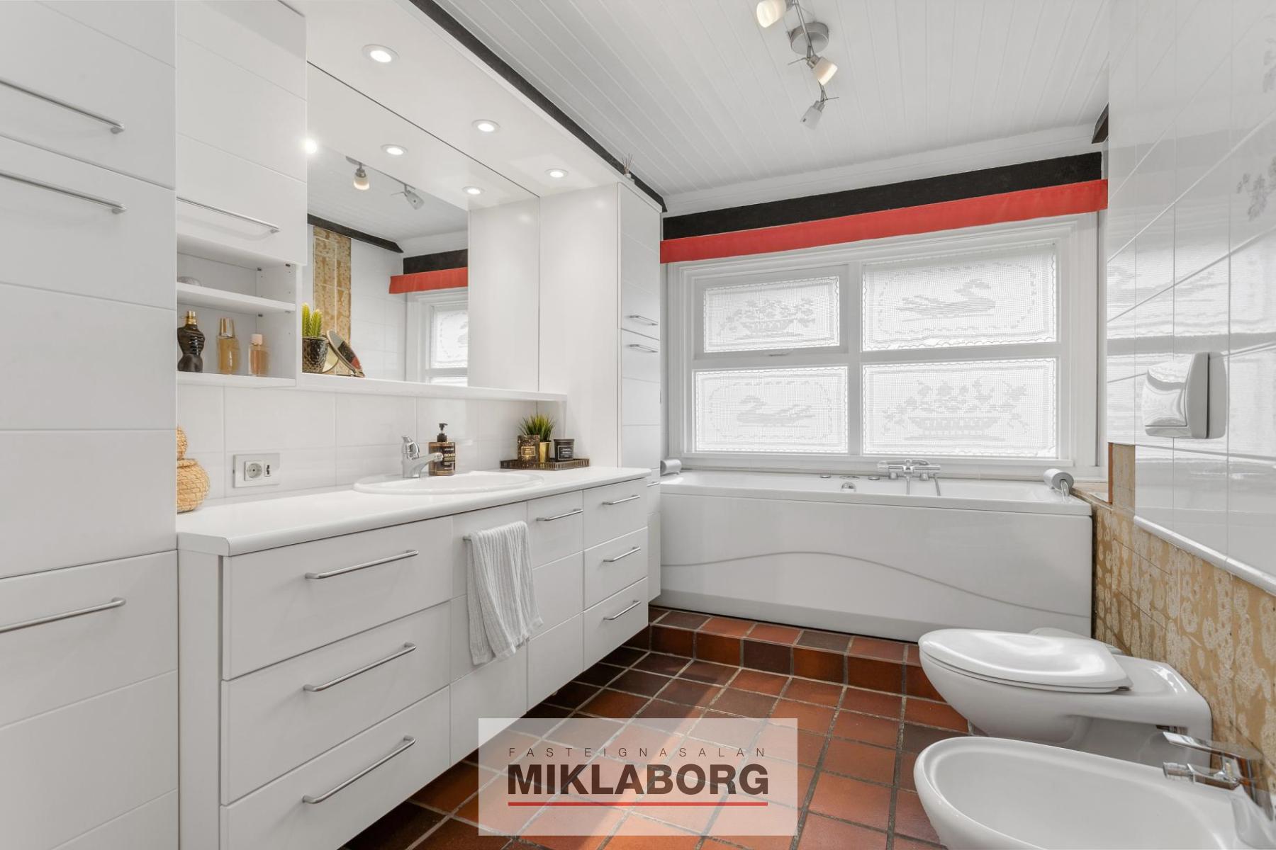 - Baðherbergi: Rúmgott með baðkari, upphengdu salerni, skolskál og gólfhita. Mikið og gott skápapláss.