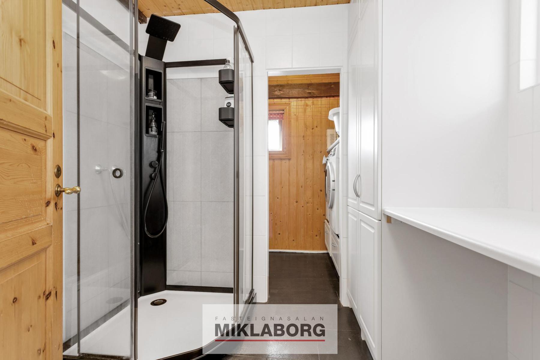 - Þvottahús: Staðsett innst á gangi. Korkur á gólfi, sturtuklefi í fremri hluta og ágætis skápapláss.