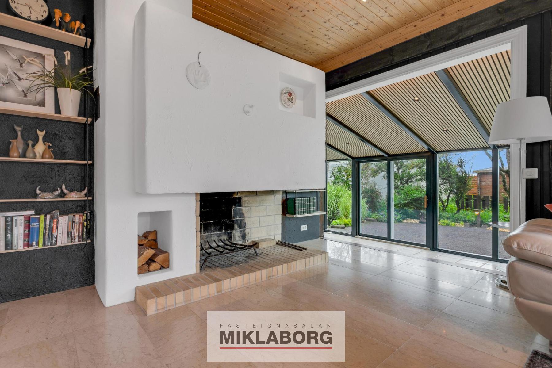 - Stofa & Borðstofa: Mjög bjart og opið rými með stórum gluggum og fallegum marmara á gólfi fyrir framan arinn. Rýmið flæðir skemmtilega inn í borðstofu og áfram niður í sólstofuna.