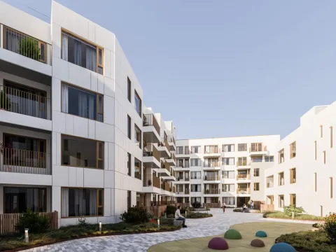 Nýr íbúðakjarni samanstendur af 115 íbúðum á 6 hæðum og afhendist í fjórum áföngum. Byggingin er í randbyggðarformi umhverfis fallegan inngarð og er hluti af nýju og spennandi hverfi á Kirkjusandi. Græn svæði umlykja húsið ásamt sameiginlegum þakgarði.