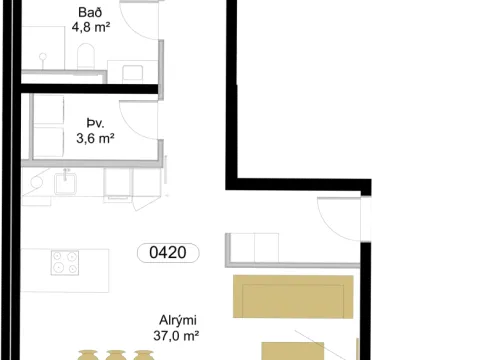Íbúð 420 er falleg 3ja herbergja íbúð á 4.hæð með yfirbyggðar svalir.