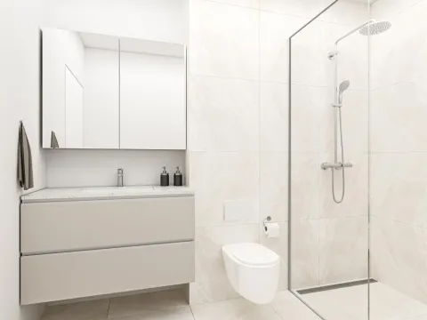 Baðherbergi: Baðherbergi er með vönduðum sérsmíðuðum innréttingum frá Egger. Borðplata með quartz plötum. Sturta með Unidrain gólfrennupakka.