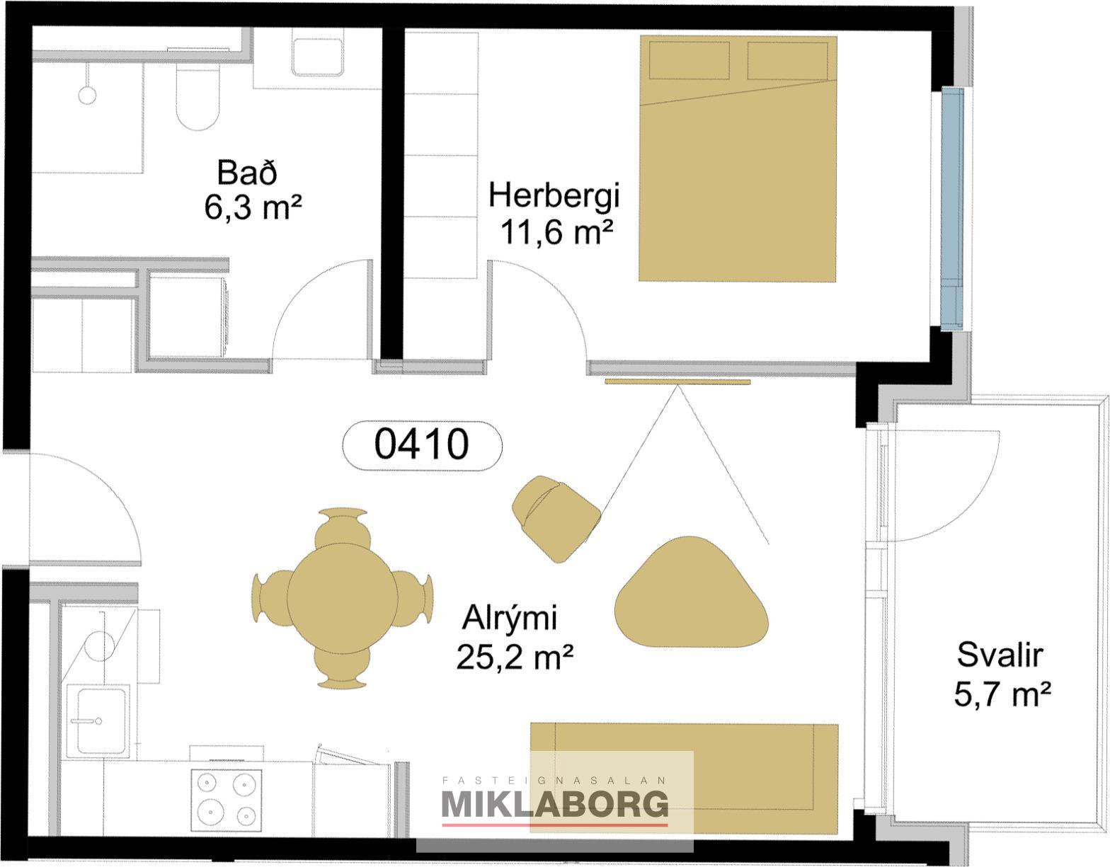 Íbúð 410 er falleg 2ja herbergja íbúð á 4.hæð með yfirbyggðar svalir er snúa til suð-austurs.