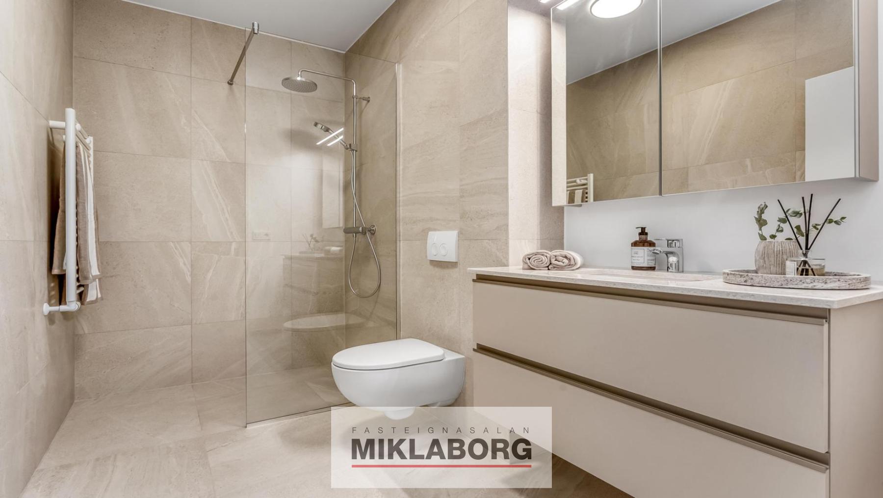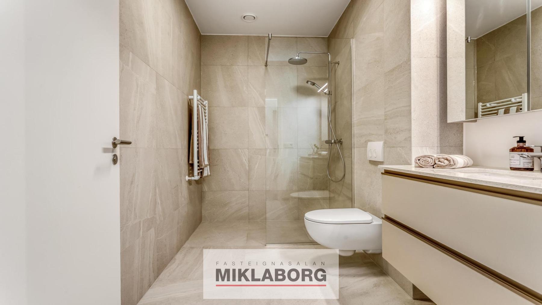 Tvö baðherbergi: Baðherbergi er með vönduðum sérsmíðuðum innréttingum frá Egger. Borðplata með quartz plötum. Sturta með Unidrain gólfrennupakka.