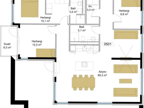 Stigahús D - íbúð 501 ásamt 50 fm þaksvölum + yfirbyggðum svölum út frá einu herberginu.