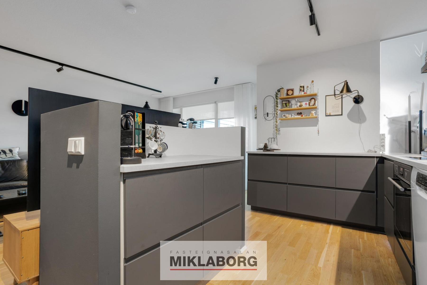 Komið er inn í forstofu með flísum á gólfi, fataskáp og skóskáp. Svefnherbergi með parketi á gólfi og stórum fataskápum. Eldhús með grárri innréttingu og ljósri borðplötu, ofni, helluborði, háf og plássi fyrir uppþvottavél og ísskáp. Stofa, borðstofa og eldhús eru í opnu alrými með parketi á gólfi og útgengt út á svalir til suðurs með svalalokun. búið er að gera auka herbergi þar sem borstofa er teiknuð. Baðherbergi með flísum á gólfi, sturtuklefa, upphengdu salerni og innréttingu með speglaskáp. Inn af baðherbergi er þvottahús þar sem vélar eru í vinnuhæð með skúffum fyrir neðan. Sér geymsla íbúðar er á jarðhæð. Stæði í bílakjallara fylgir eigninni, búið er að leggja fyrir bílahleðslu í stæðið.