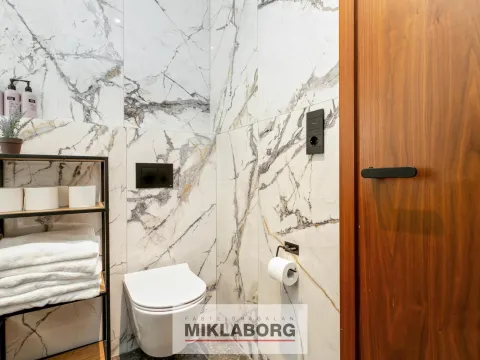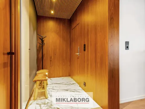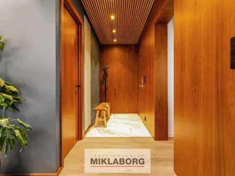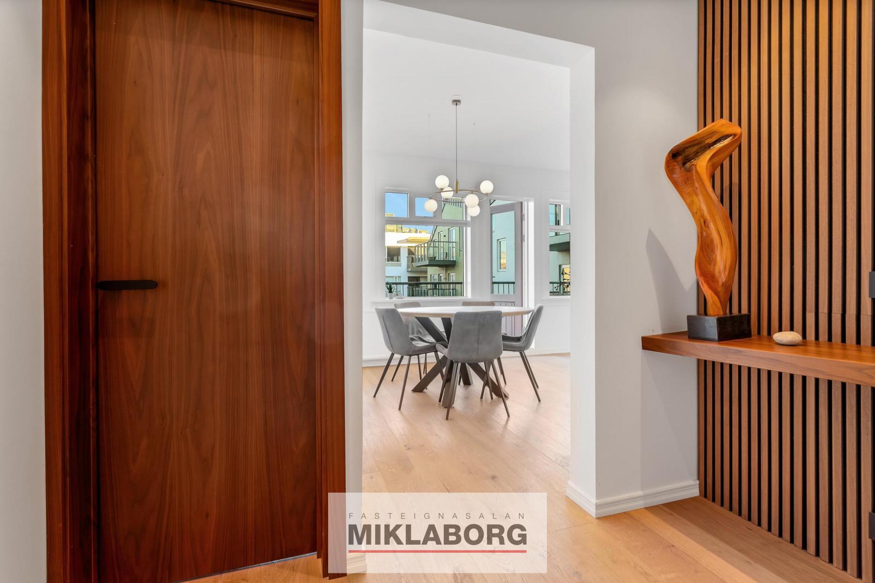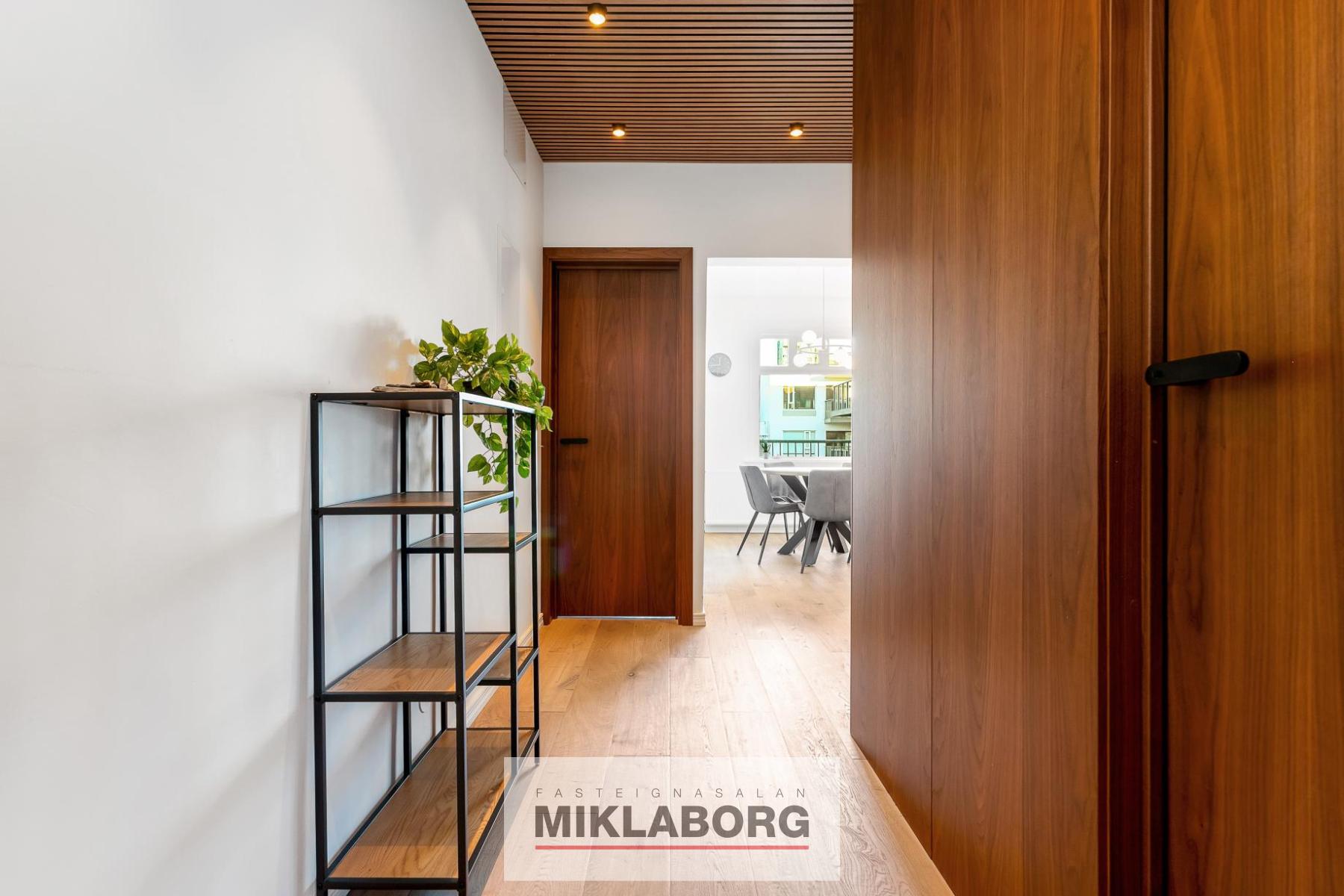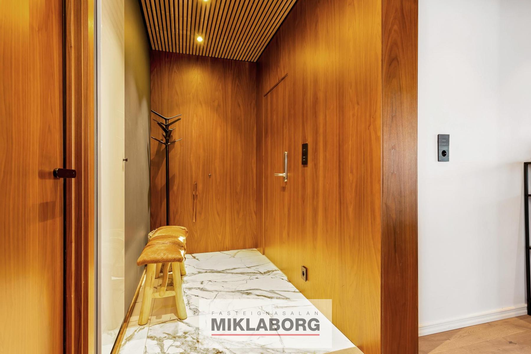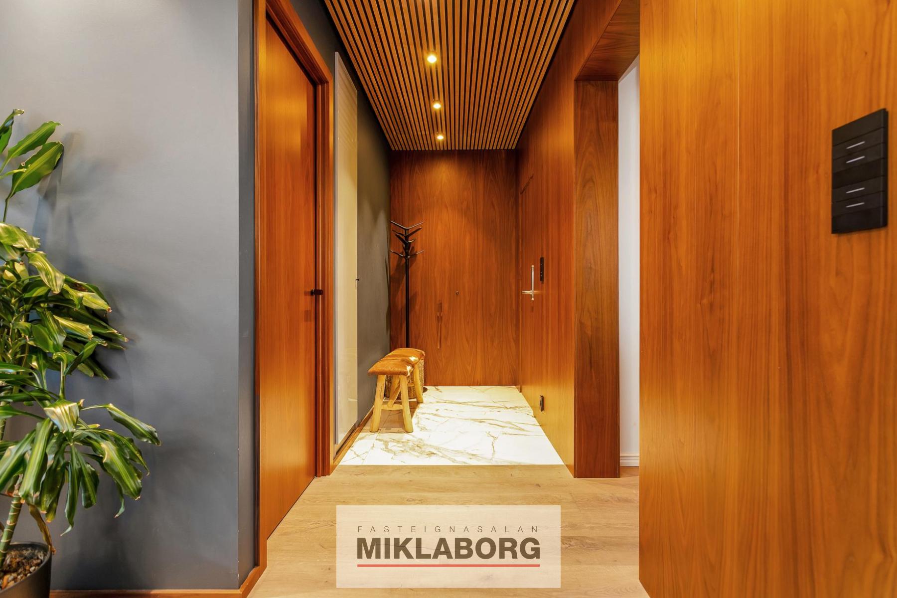 Gengið er inn í flísalagða forstofu með innbyggðum fataskáp. Loft er klætt með hljóðdempandi hnotuplötum og fallegri innbyggðri central lýsingu.