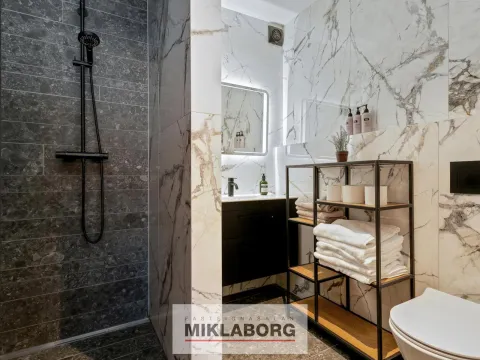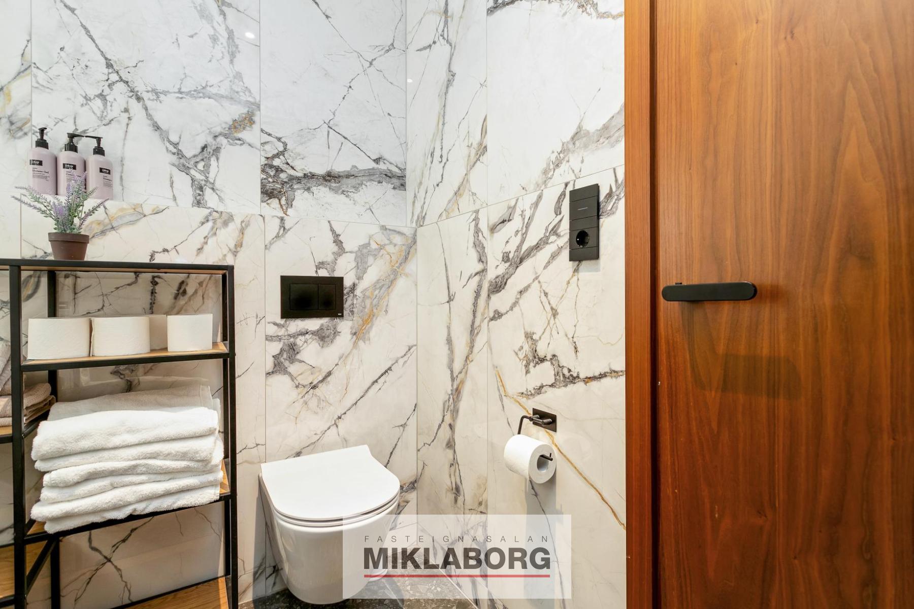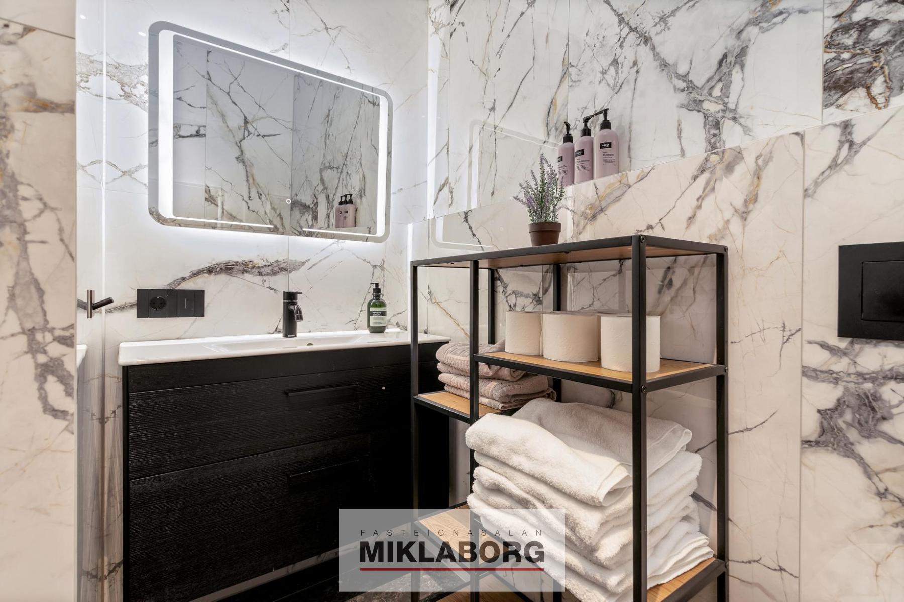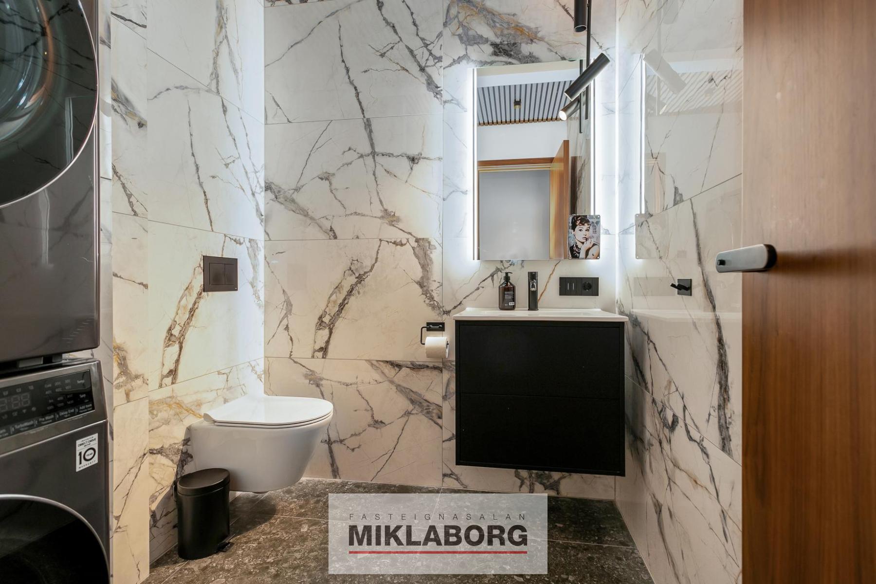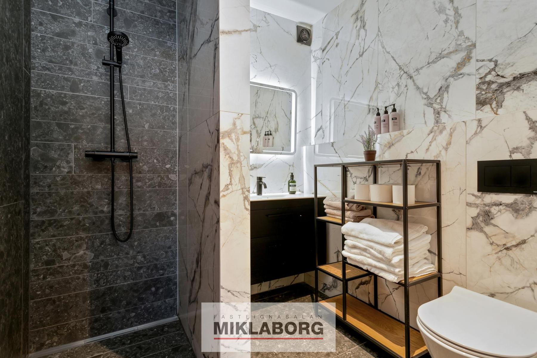 - Tvö baðherbergi flísalögð í hólf og gólf, bæði með gólfhita. Annað með „walk-in“ sturtu og Ifø innréttingu frá Tengi, hitt með þvottaaðstöðu.