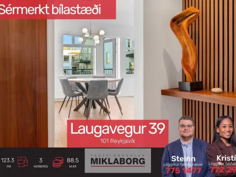 Miklaborg kynnir: Glæsileg og mikið endurnýjuð 3ja herbergja íbúð á 2. hæð með sérmerktu bílastæði við Laugaveg 39 í 101 Reykjavík. Eignin er skráð 123,3, með henni fylgir sérmerkt bílastæði á baklóð og rúmgóð 23,3 fm geymsla í kjallara. Eignin er í vel viðhöldnu fjölbýlishúsi sem var byggt árið 1942. Eignin skiptist í anddyri, tvö rúmgóð svefnherbergi, bjarta stofu, tvö baðherbergi, eldhús með eyju, svalir og bílastæði. Vel staðsett eign á eftirsóttum stað í 101 Reykjavík þar sem stutt er í verslanir, þjónustu, kaffihús, veitingastaði og sundlaug.