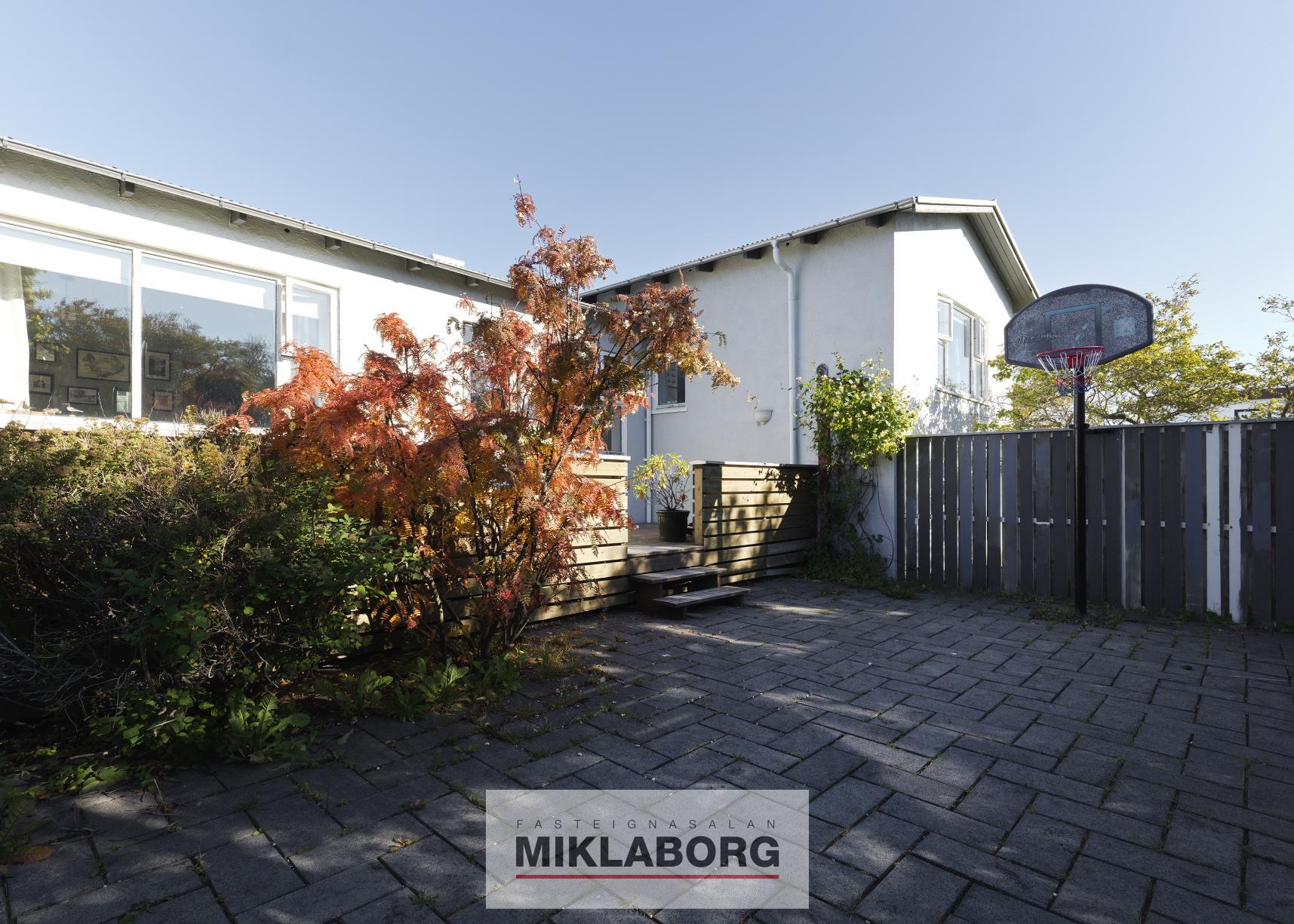 NÁNARI LÝSING: Komið inn í anddyri og þaðan gengið inn í hol. Tvær rúmgóðar stofur ásamt góðu sjónvarpsholi með útgengt á stórar suðurverönd og þaðan út í garðinn. .Eldhús er með snyrtilegri innréttingu, borðkrók og tengi fyrir uppþvottavél. Gestasalerni og þvottahús eru á hæðinni. Úr holi er gengið upp á svefnherbergisgang. Þrjú góð svefnherbergi eru á pallinum ásamt rúmgóðu baðherbergi með glugga, baðkari og sturtu. Í kjallara er rúmgott svefnherbergi, baðherbergi og tvær stórar geymslur. Einnig er búið að útbúa í kjallara góða 2ja herbergja aukaíbúð með sérinngangi sem gefur góðar leigutekjur. Bílskúrinn er rúmgóður og hefur verið endurnýjaður mikið að innan og er nýttur í dag sem stúdíó.