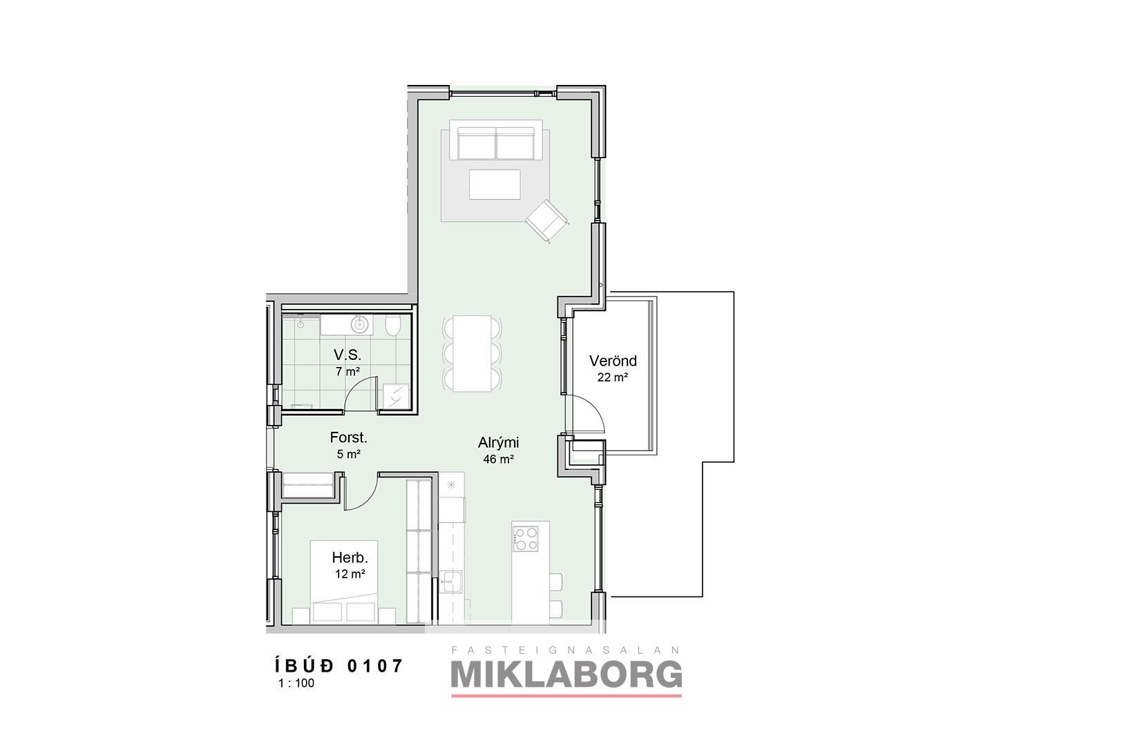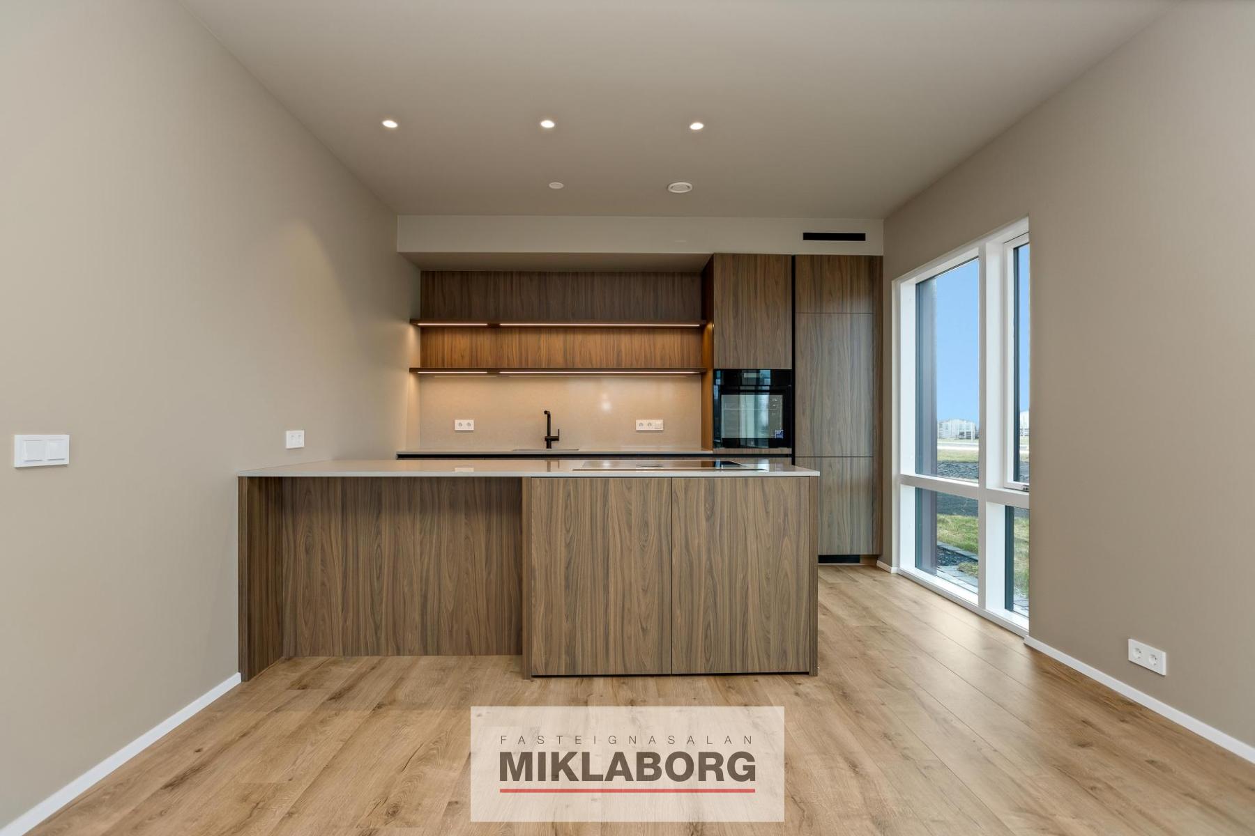 Nánari lýsing: Íbúð 107 er 83,2 fm ásamt 12,0 fm geymslu, samtals 95,2 fm. Þegar inn er komið tekur við forstofa. Alrými sem saman stendur af stofu, borðstofu og eldhúsi. Vandaðar innréttingar, sjá nánari upplýsingar í skilalýsingu sem liggur fyrir. Eitt svefnherbergi ásamt baðherbergi með tengi fyrir þvottavél og þurrkara. Sér geymsla í kjallara og stæði í bílageymslu.