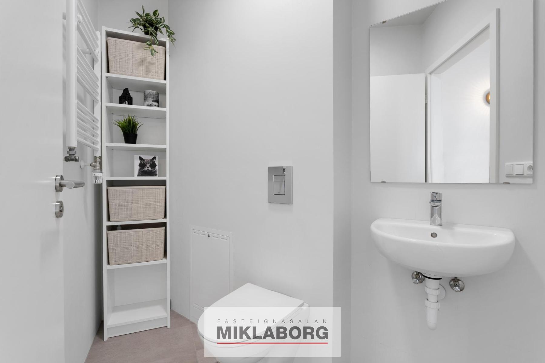 Baðherbergi: er flísalagt í hólf og gólf með sturtu og hvítri innréttingiu, handklæðaofni og upphengdu salerni. Inn á baðherberginu er þvottaaðstaða með tengi fyrir þvottavél og þurrkara.