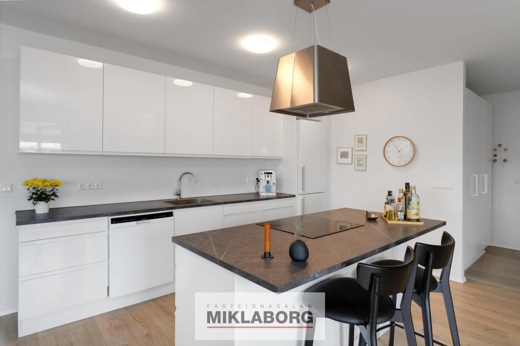 Alrýmið: er bjart með glugga á tvo vegu, stofan samliggjandi borðstofu og eldhúsi. Útgengi út á tvennar svalir í alrýminu sem snúa vel gagnvart sólu. Eldhúsið er með vönduðum innréttingum frá HTH og AEG tækjum.