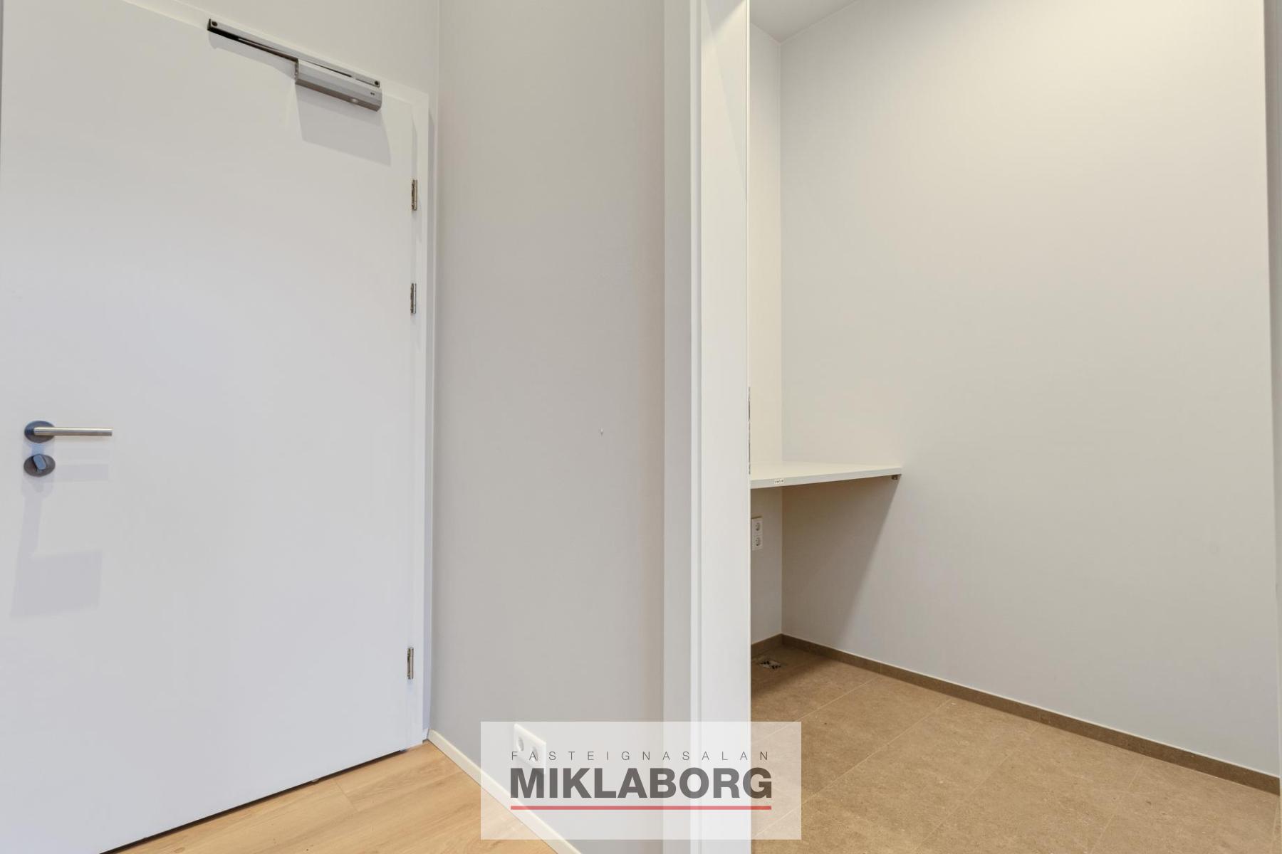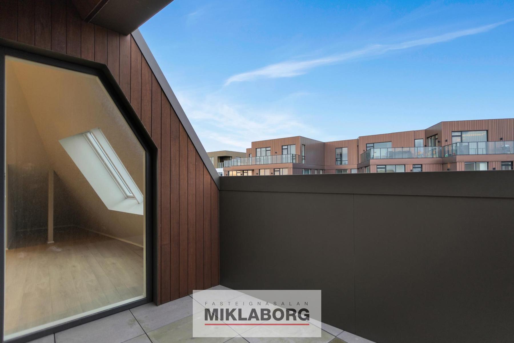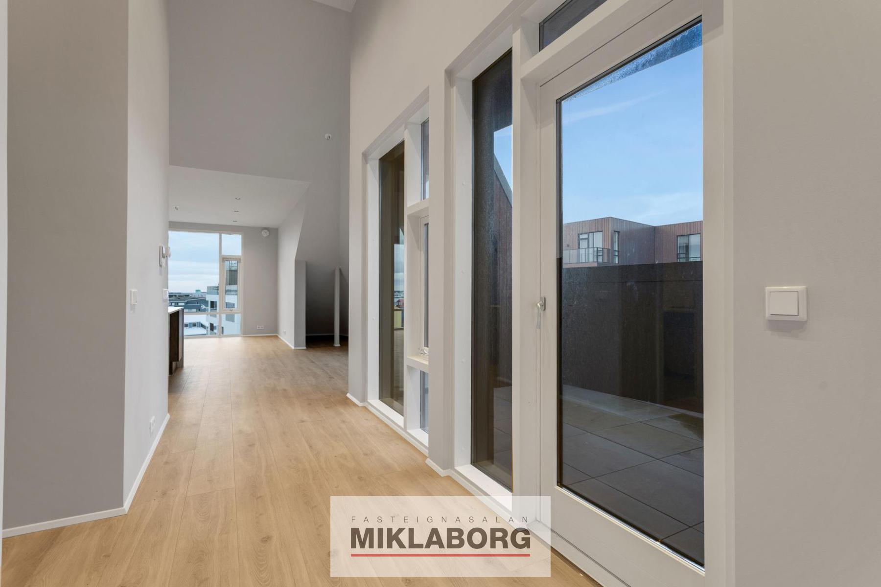 Gengið er inn í forstofu með miklu skápaplássi og til vinstri er sér þvottahús. Á móti taka við fyrri þaksvalir sem snúa til vesturs með fallegu útsýni.