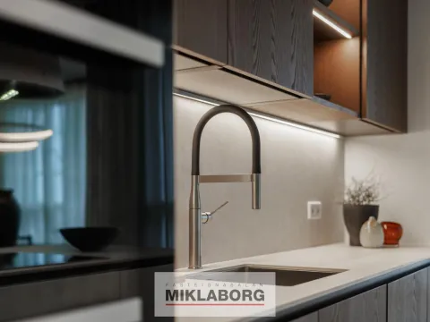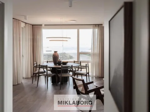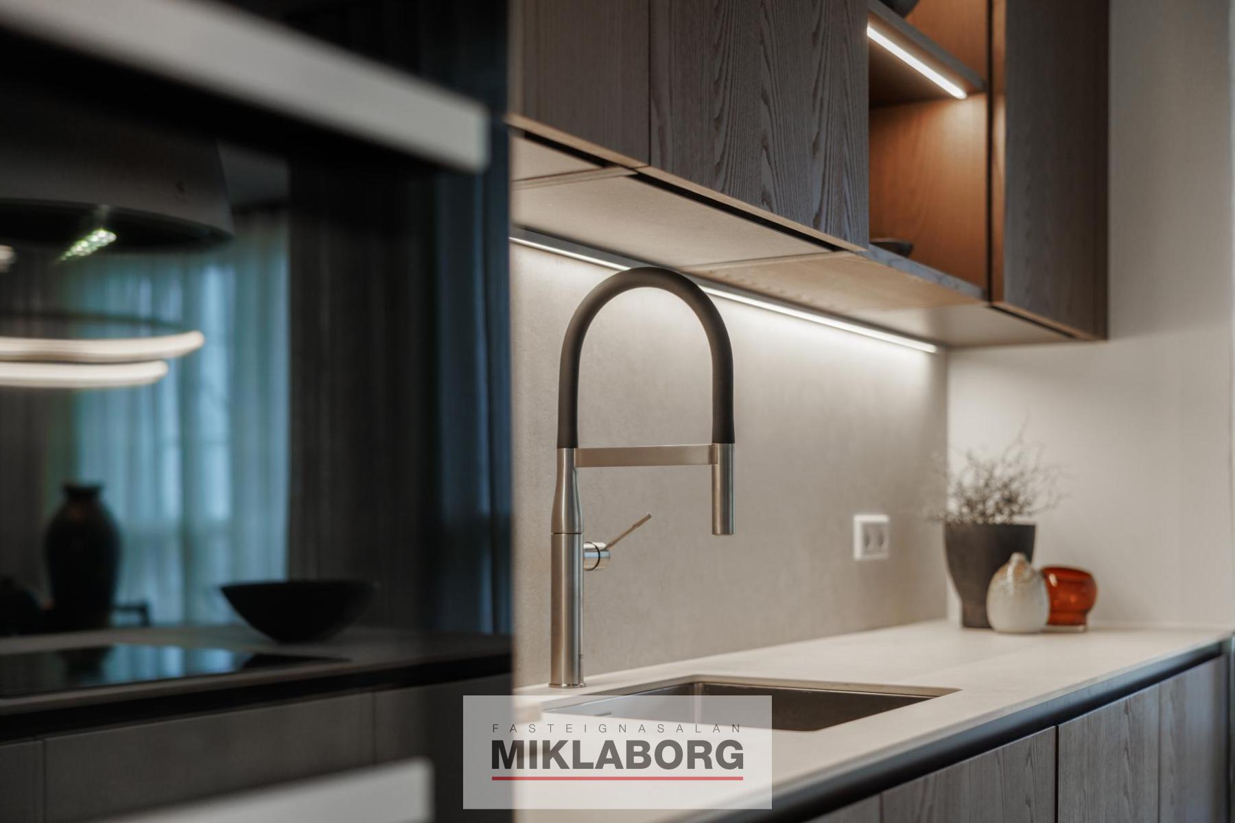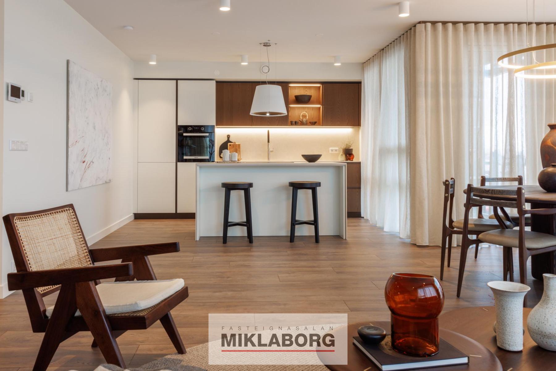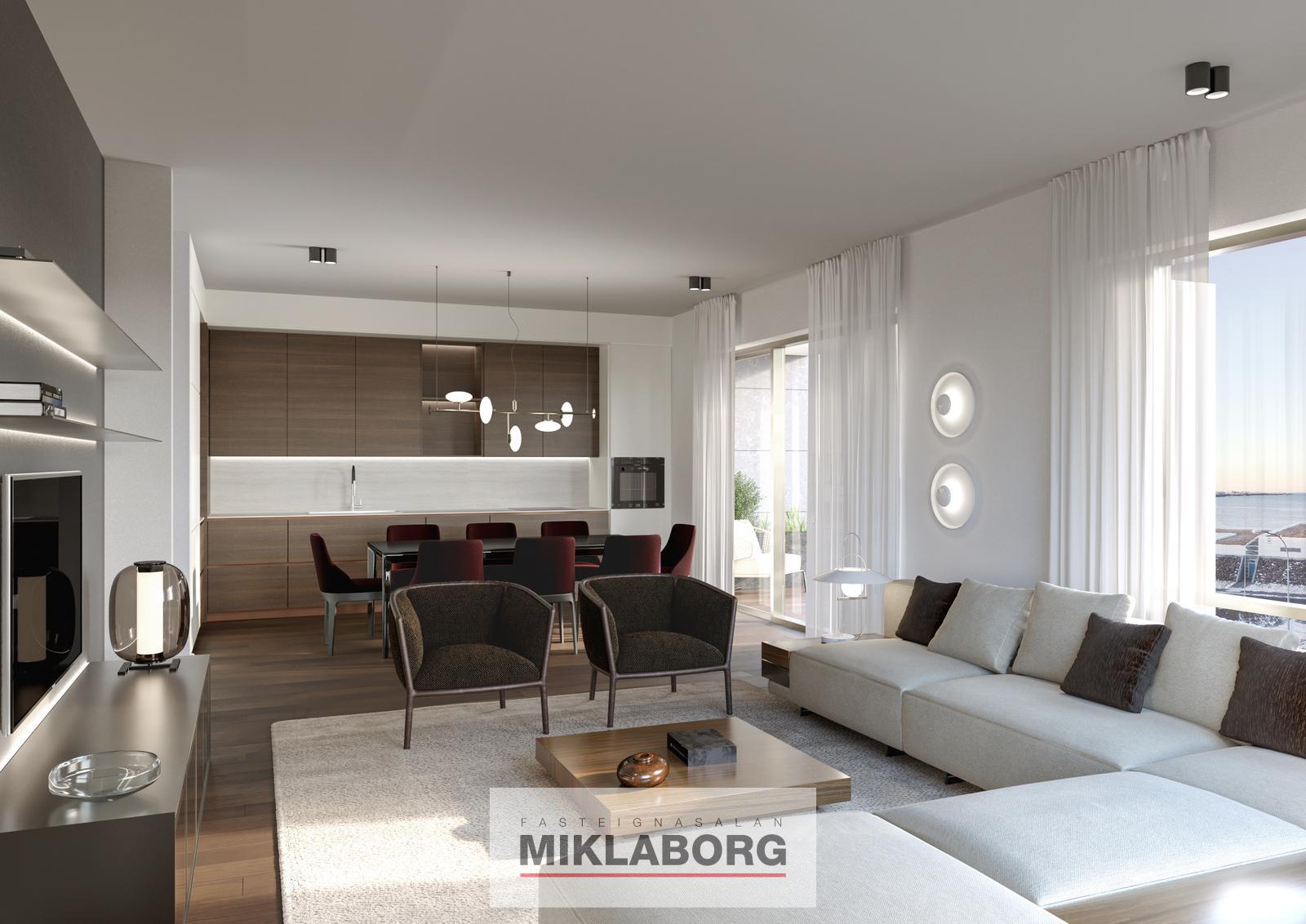 Íbúðirnar afhendast með hágæða ítölskum innréttingum frá Cassina og er innréttingar þema þessarar íbúðar EIMUR. Vönduð tæki frá Miele og Siemens. Steinborðplötur og gólfsíðir gluggar. Allar íbúðir eru með gólfhita.