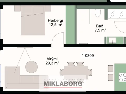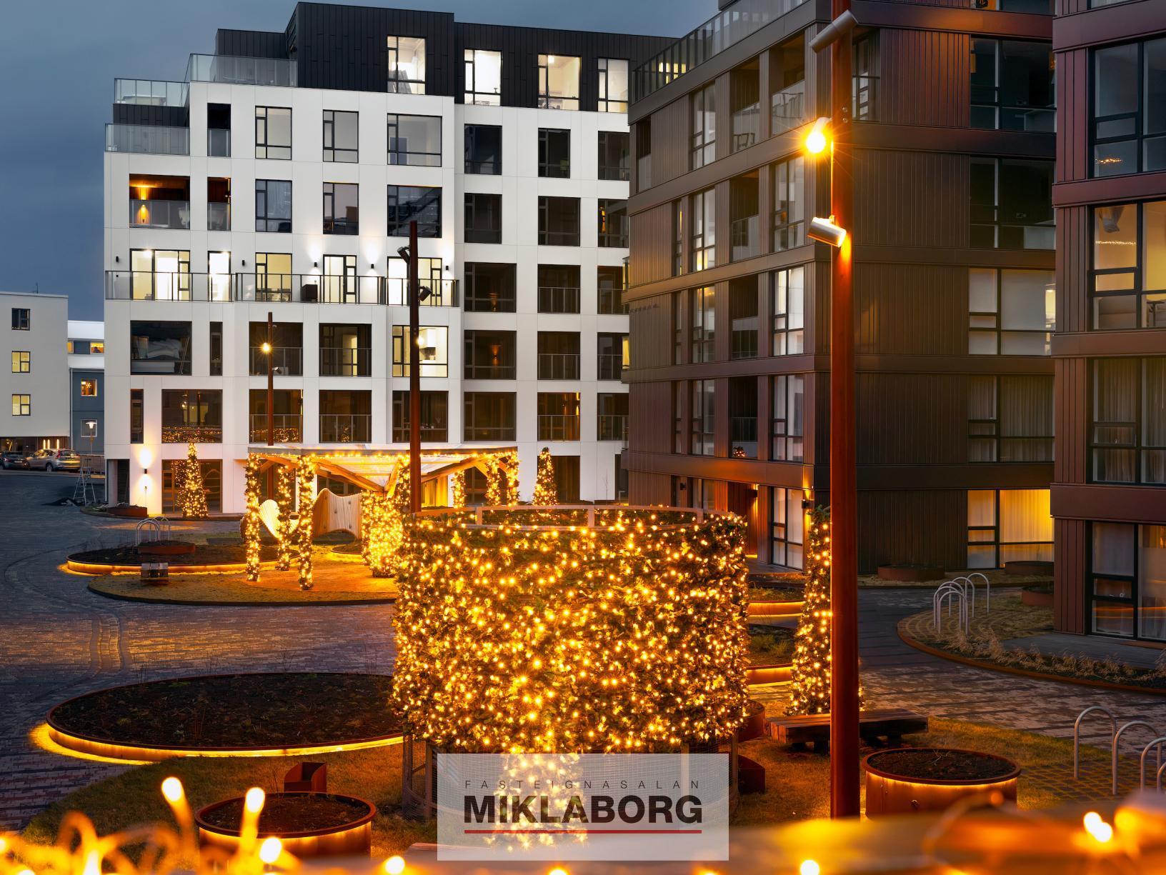 Íbúð 309 er 2ja herbergja íbúð á 3. hæð og snýr út að inngarði hússins. Íbúar hafa aðgang að verslun og þjónustu. Íbúðarrýmið skiptist í bjarta stofu og eldhús, svefnherbergi og baðherbergi með sturtu . íbúðin er skráð 69,7 m² með 5,8 m² geymslu.