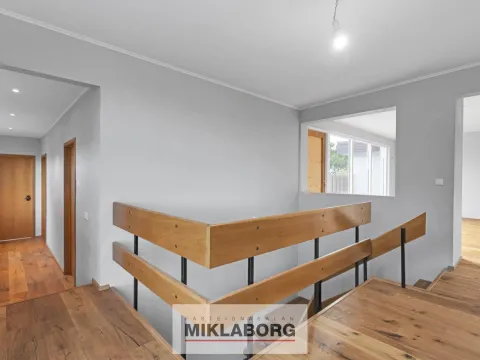 Efri hæðin skipstist í forstofuherbergi, svefnherbergisgang með tveimur svefnherbergjum og er útgengt úr öðru þeirra út í garð. Nýstandsett baðherbergi með sturtu, upphengdu salerni, fallegri innréttingu og glugga. Rúmgott eldhús með nýrri hvítlakkaðri innréttingu, nýjum tækjum, borðkrók og góðum gluggum með fallegu útsýni. Stofan er björt og rúmgóð. Frá stofu er gengið í nýjan sólskála og þaðan út í góðan garð.