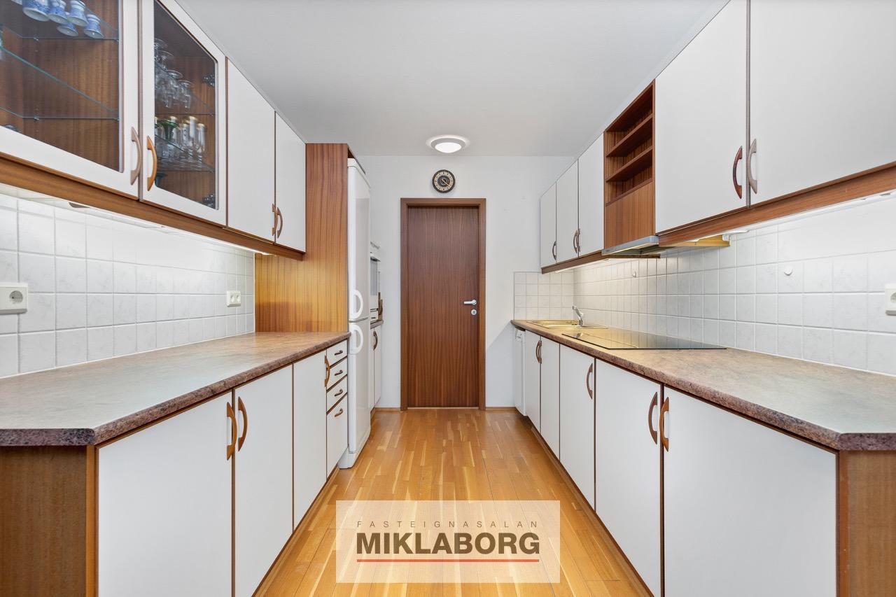 Miklaborg kynnir: Falleg og vel skipulögð þriggja herbergja 120 fm útsýnisíbúð á 7. hæð (efstu) í viðhaldslitlu fjölbýli í Núpalind í Kópavogi. Íbúðin er skráð 120 fm en auk þess fylgja íbúðinni tvö stæði í bílageymslu sem eru samtals 28 fm. Alls er eignin skráð 148,1 fm. Á hæðinni eru aðeins tvær íbúðir. Eignin skptist í forstofu, tvö svefnherbergi, eldhús, þvottahús, baðherbergi, stofu,borðstofu, yfirbyggðar svalir, búr og tvö stæði í bílastæðahúsi