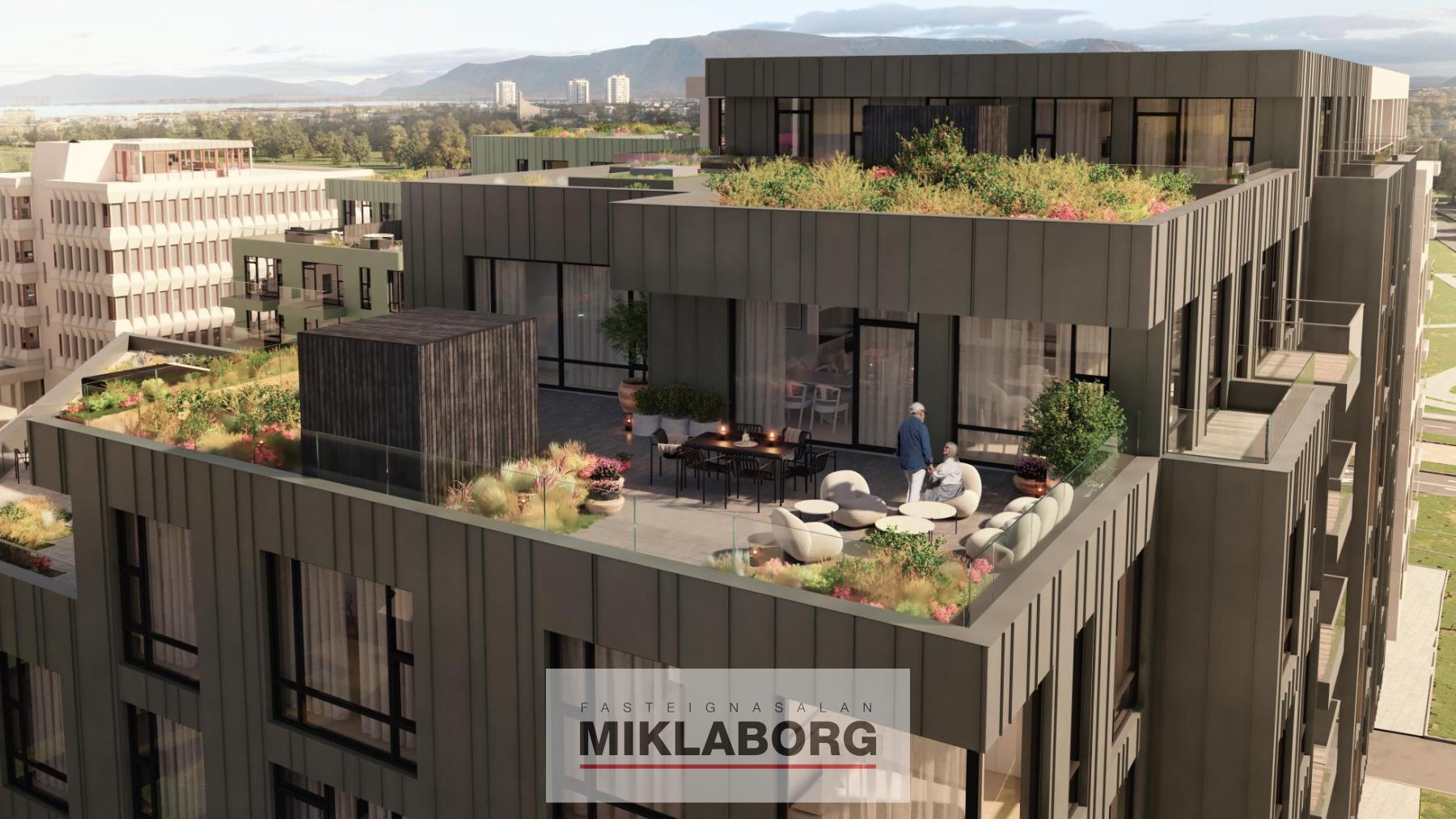 Stórglæsileg penthouse íbúð á sjöttu hæð. Bílskúr í bílakjallara og stórar þaksvalir með heitum pott.