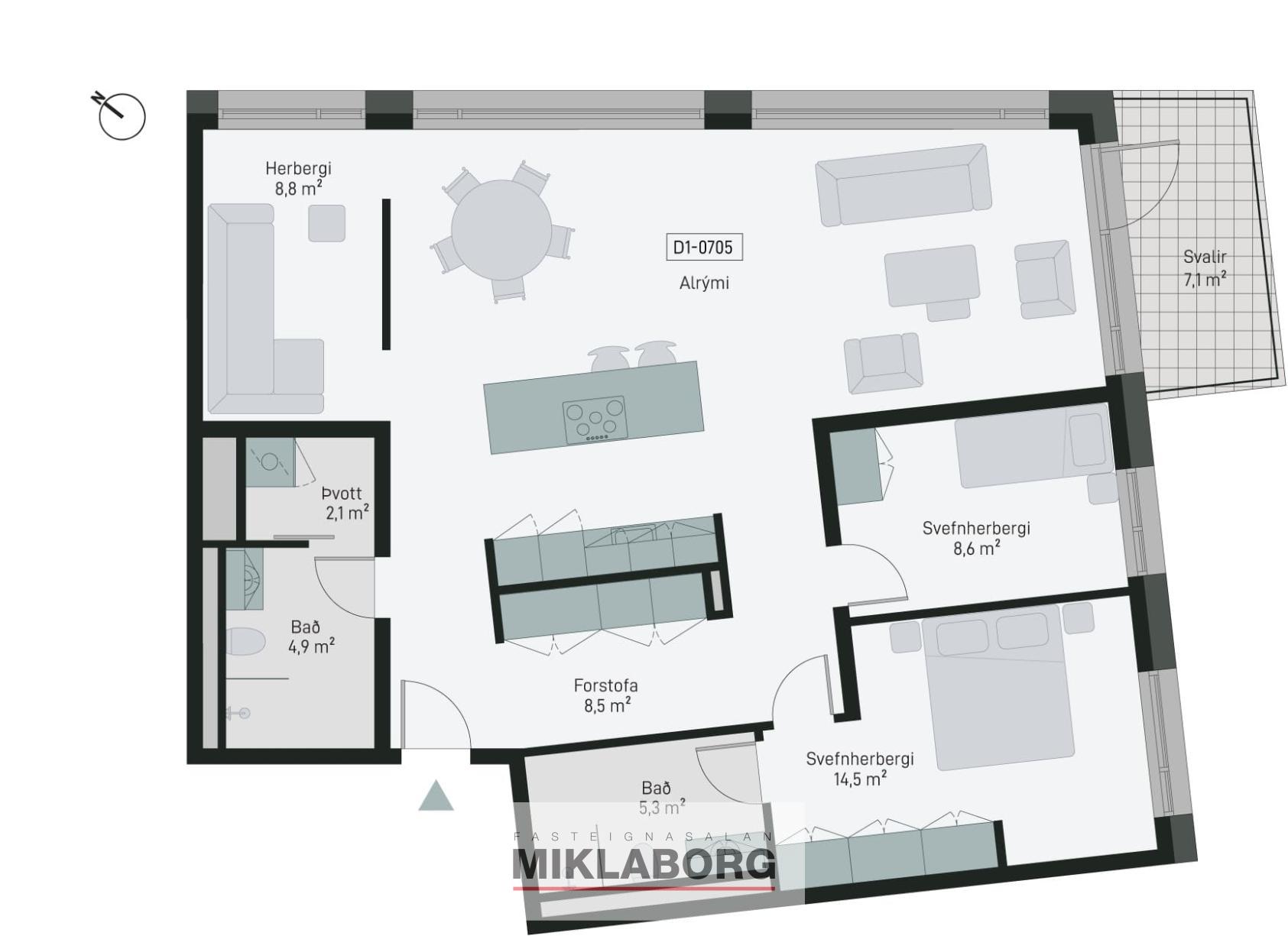 Íbúð 705 er 130,1 fm fjögurra herbergja íbúð á sjöundu hæð. Geymsla 13,8 fm og 7,1 fm svalir sem snúa í átt að Grensás.