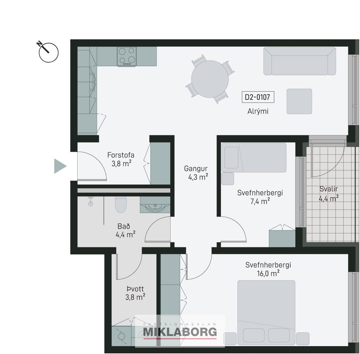 Íbúð 107 er 82,8 fm þriggja herbergja íbúð á fyrstu hæð. Geymsla 9,4 fm og svalir sem snúa í átt að inngarðinum. Innrétting K2 (Safír Klassík 2). Eignin skiptist í forstofu með góðu skápaplássi. Tvö svefnherbergi, baðherbergi, þvottahús og eldhús í alrými. Stofu og borðstofu. Íbúðin er afhent með öllum Siemens raftækjum í eldhúsi og vönduðum innréttingum frá GKS. Íbúðir eru afhentar án megin gólfefna. Baðherbergi eru flísalögð.