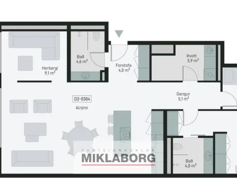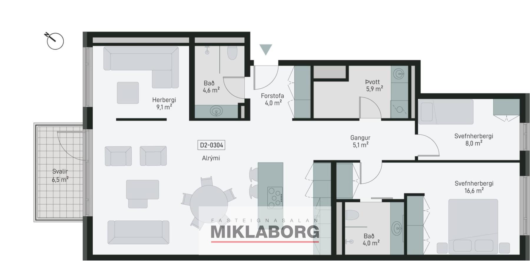 Íbúð 304 er 130,3 fm fjögurra herbergja íbúð á þriðju hæð. Geymsla 17,2 fm og svalir sem snúa í átt að inngarðinum. Innrétting VAL (Safír Harmónía). Eignin skiptist í forstofu með góðu skápaplássi. Hjónasvítu með sér baðherbergi. Tvö herbergi, baðherbergi, þvottahús og eldhús í alrými. Stofu og borðstofu. Íbúðin er afhent með öllum Siemens raftækjum í eldhúsi og vönduðum innréttingum frá GKS. Íbúðir eru afhentar án megin gólfefna. Baðherbergi eru flísalögð.