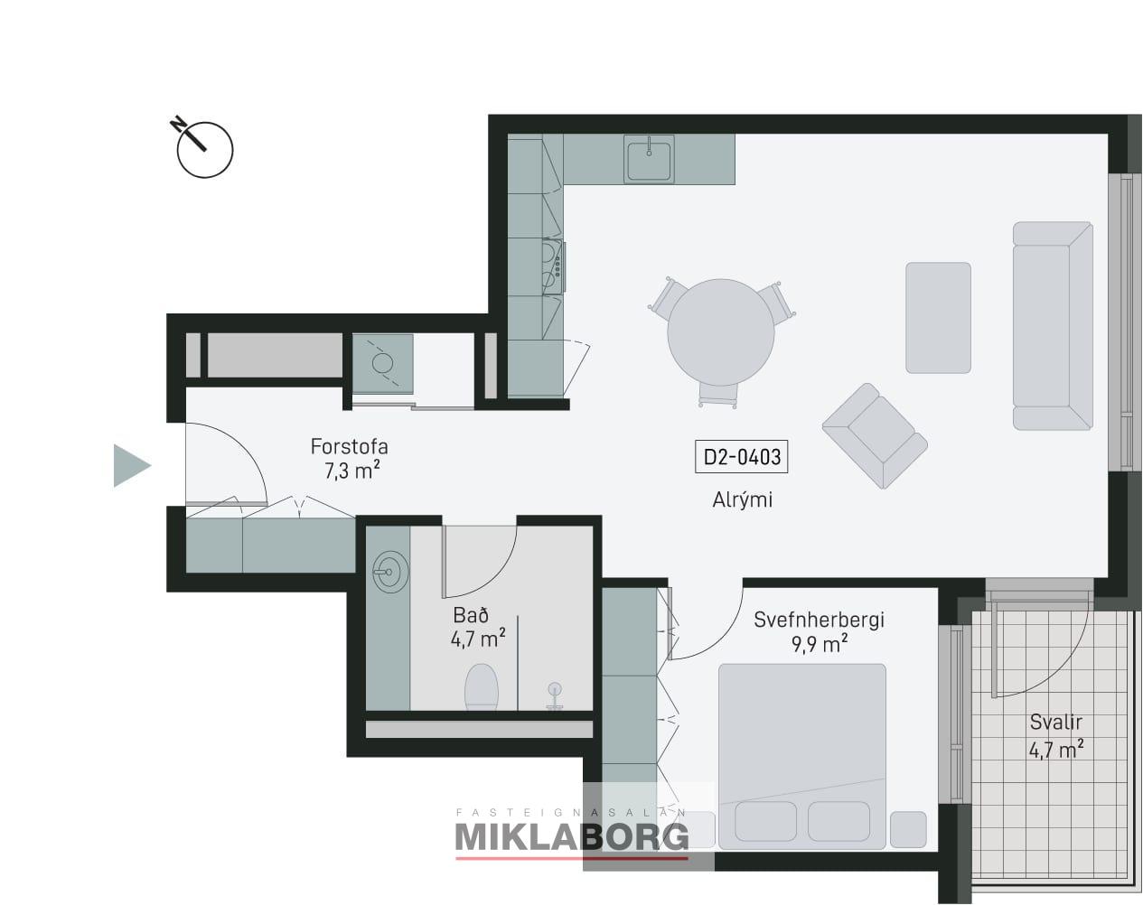 Íbúð 403 er 69,7 fm tveggjaherbergja íbúð á fjórðuhæð. Geymsla 5,4 fm og svalir sem snúa í átt að Grensás. Innrétting VAL (Safír Harmónía). Eignin skiptist í forstofu með góðu skápaplássi. Svefnherbergi, baðherbergi og eldhús í alrými. Stofu og borðstofu. Íbúðin er afhent með öllum Siemens raftækjum í eldhúsi og vönduðum innréttingum frá GKS. Íbúðir eru afhentar án megin gólfefna. Baðherbergi eru flísalögð..