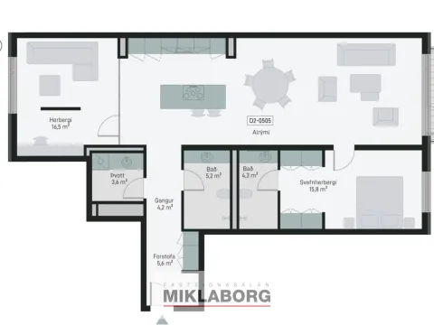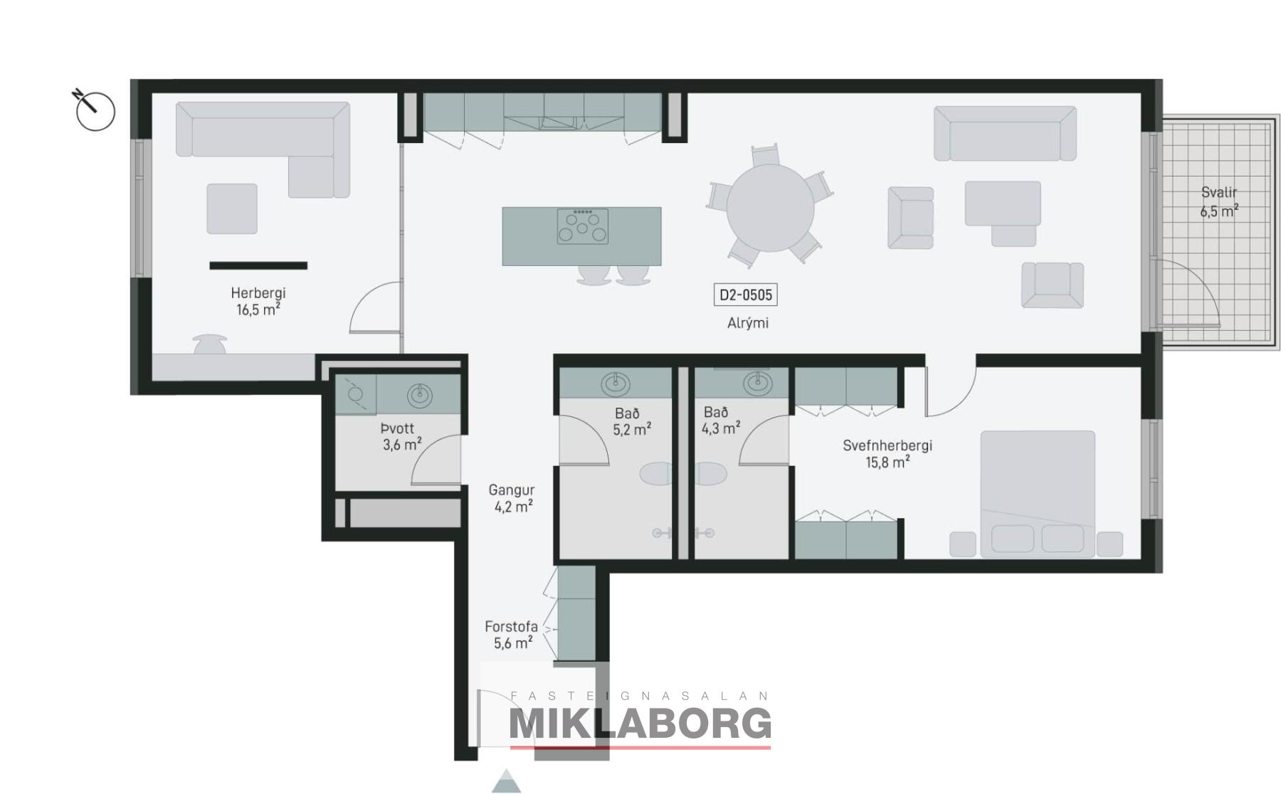 Íbúð 505 er 127,4 fm þriggja herbergja íbúð á fimmtu hæð. Geymsla 11,7 fm og svalir sem snúa í átt að Grensás. Innrétting VAL (Safír Harmónía). Eignin skiptist í forstofu með góðu skápaplássi. Hjónasvítu með sér baðherbergi. Svefnherbergi, baðherbergi, þvottahús og eldhús í alrými. Stofu og borðstofu. Gert ráð fyrir þvottvél og þurrkara inni. Íbúðin er afhent með öllum Siemens raftækjum í eldhúsi og vönduðum innréttingum frá GKS. Íbúðir eru afhentar án megin gólfefna. Baðherbergi eru flísalögð.
