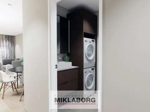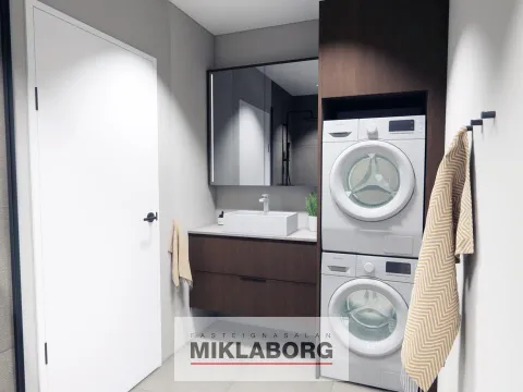 Gólfefni íbúða er vínyl parket í eikarlit. Á votrýmum eru 60x60 flísar.