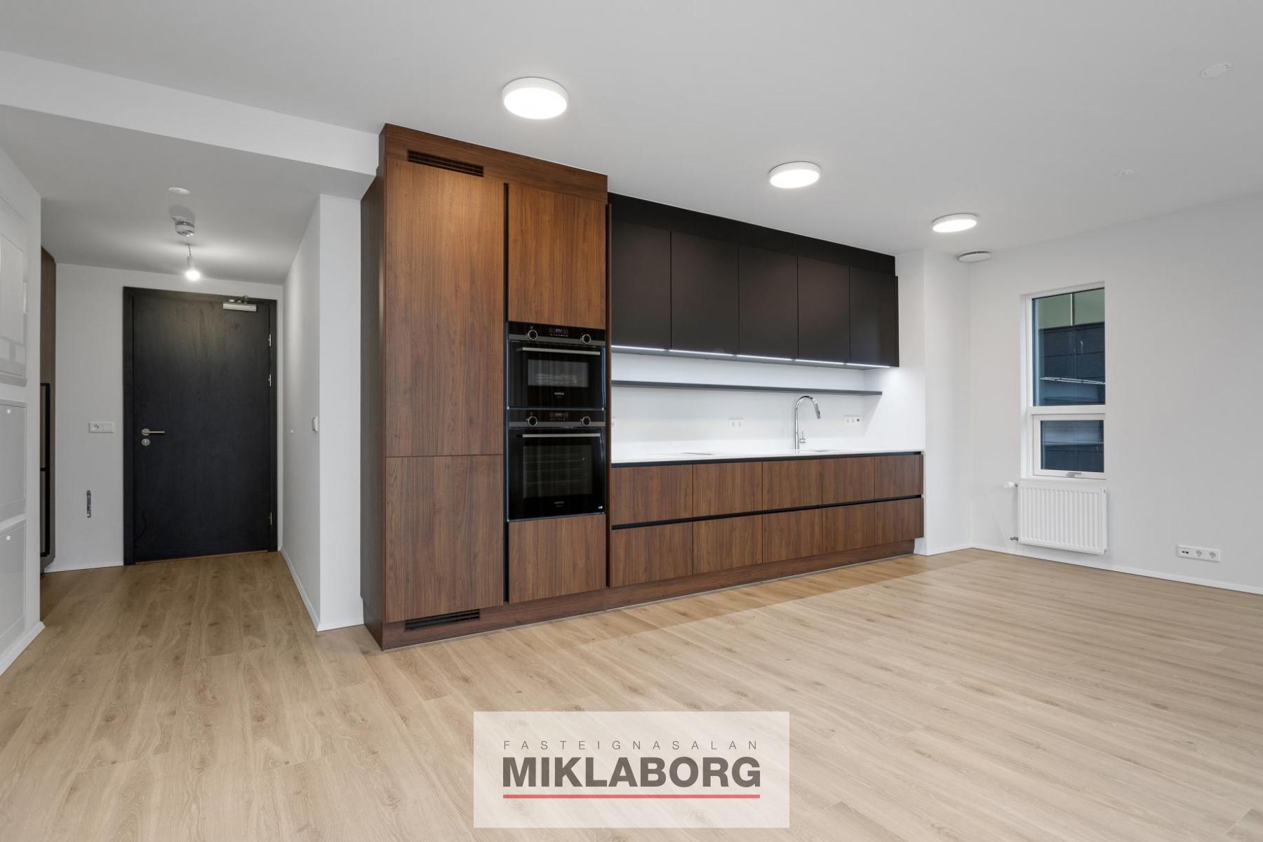 Alrými- eldhús- stofa og borðstofa: Opið alrýmið er með miklu útsýni og útgengi á rúmgóðar svalir. Eldhúsið er með innréttingum af vandaðri gerð frá Nobilia/GKS með kvarts-stein á borði. Í eldhúsi er innbyggð uppþvottavél og ísskápur, tvennir ofnar (hefðbundinn og combi) og helluborð með gufugleypi. Parket á gólfi.
