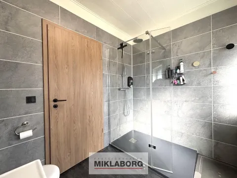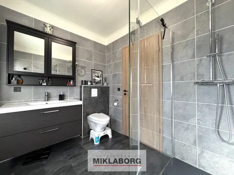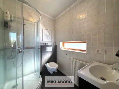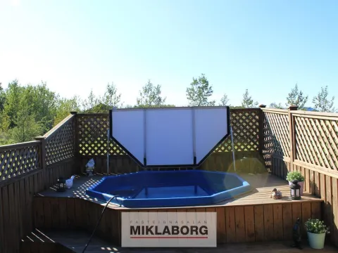 Baðherbergi: Við enda forstofugangs er baðherbergi. Vinyl flísar á gólfi og fibo baðplötur á veggjum. Sturta, innrétting og upphengt WC. Útengt út á pall frá baðherbergi að pottasvæði.