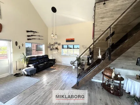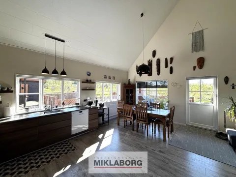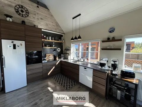 Eldhús, borðstofa og stofa: Stór og góð eldhúsinnrétting, gott borðpláss og skápapláss. Björt og opin stofa og borðstofa. Mikil lofthæð í alrými. Útengt frá borðstofu út á pall. Aðalhæð er skráð 95,3 fm.