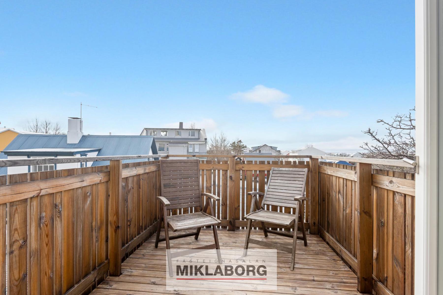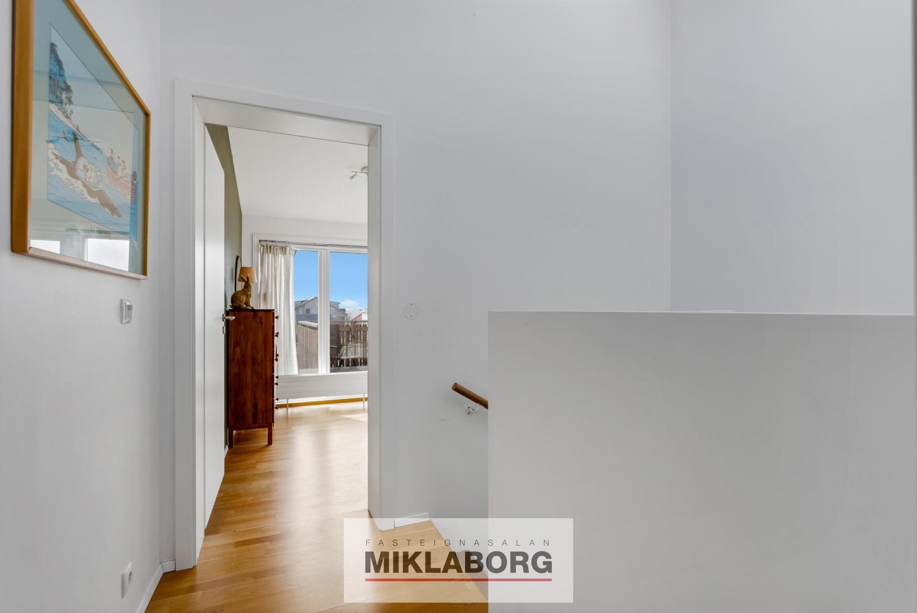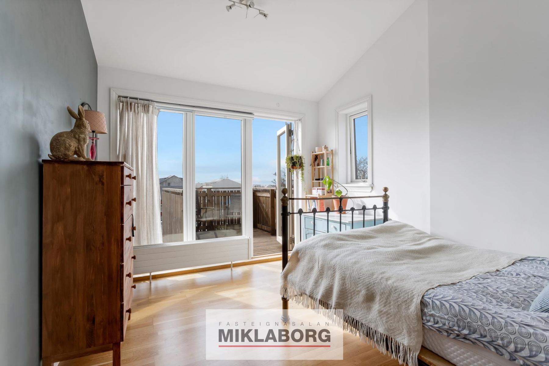 Á efstu hæð eru tvö svefnhergbergi þar sem útgengt er á svalir úr öðru þeirra á suður hlið hússins.