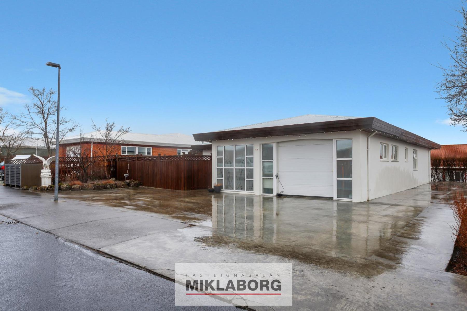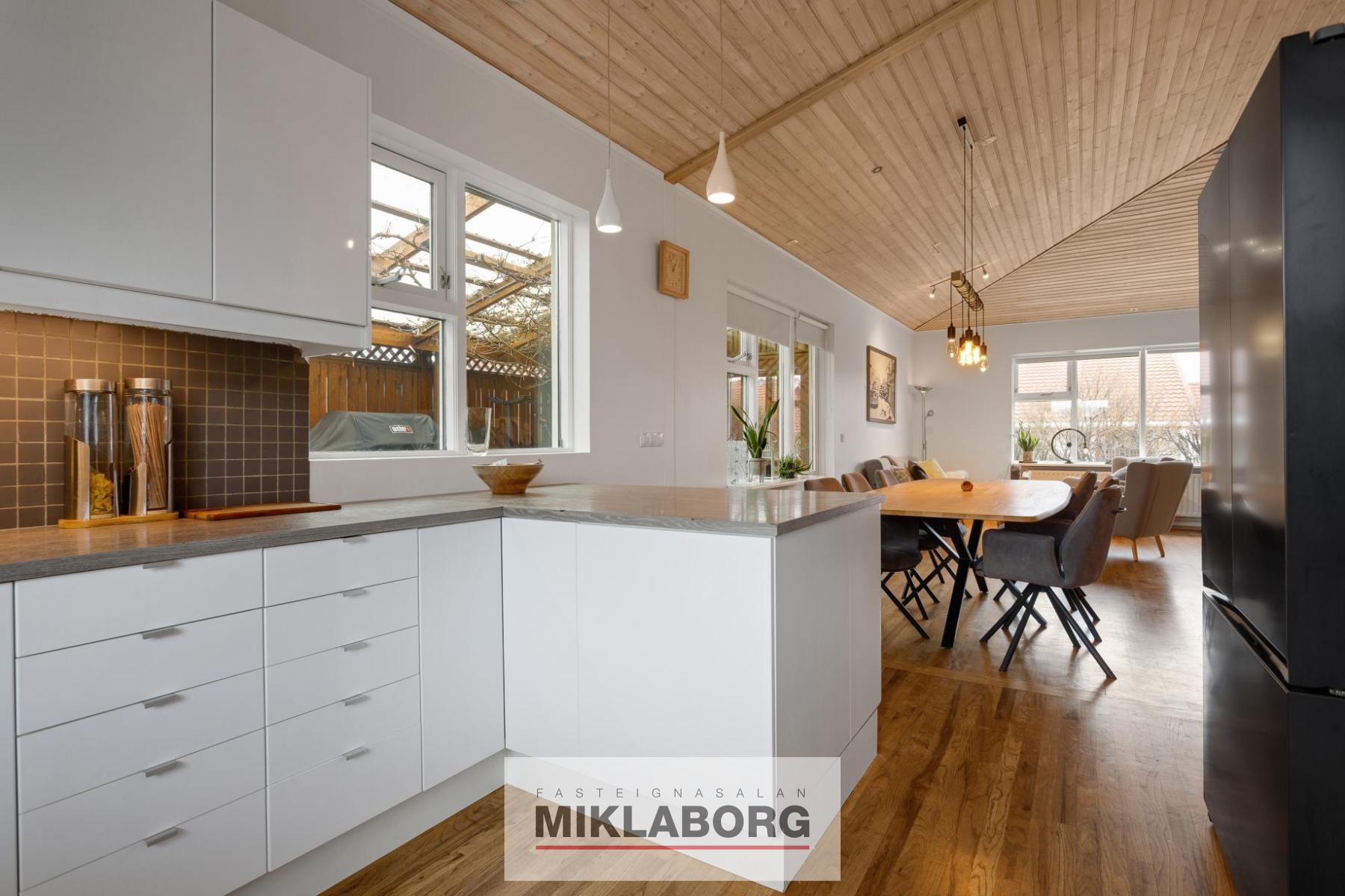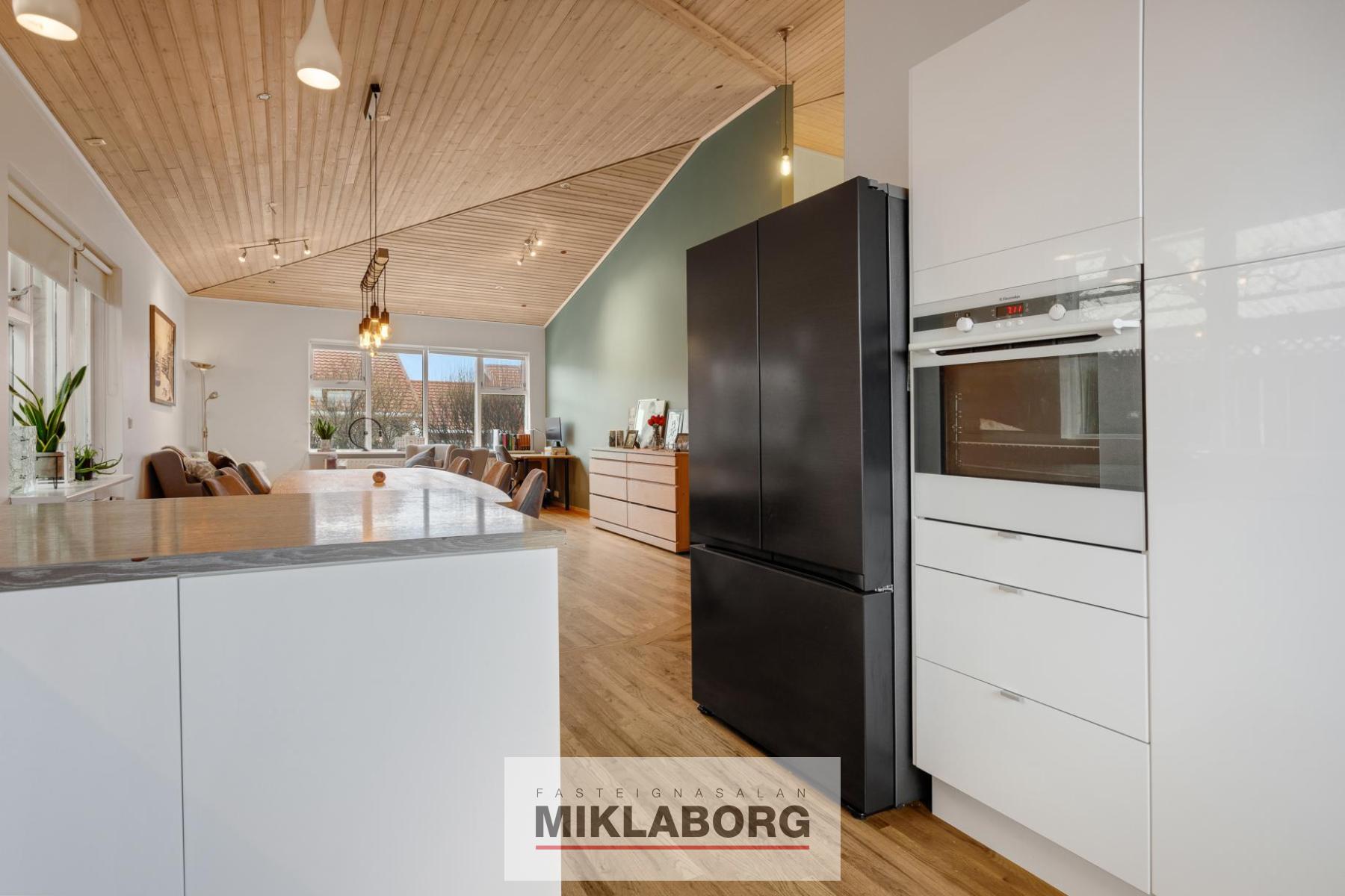 Nánari lýsing Komið er inn í stóra og bjarta forstofu en úr henni er gengið annars vegar inn í bílskúr og hins vegar í húsið sjálft, þegar komið er inn úr forstofu er gegnið inn í alrými og þaðan inn í önnur rými eignarinnar en þau eru: