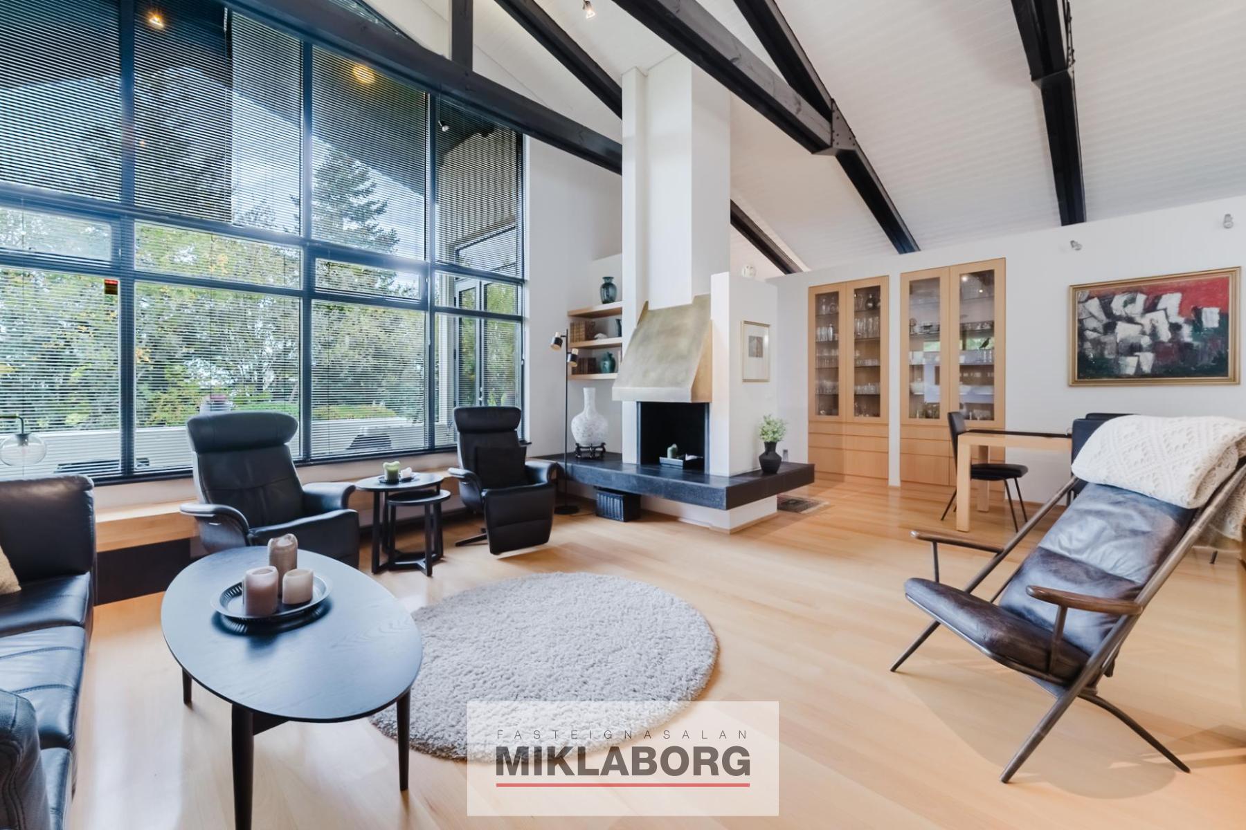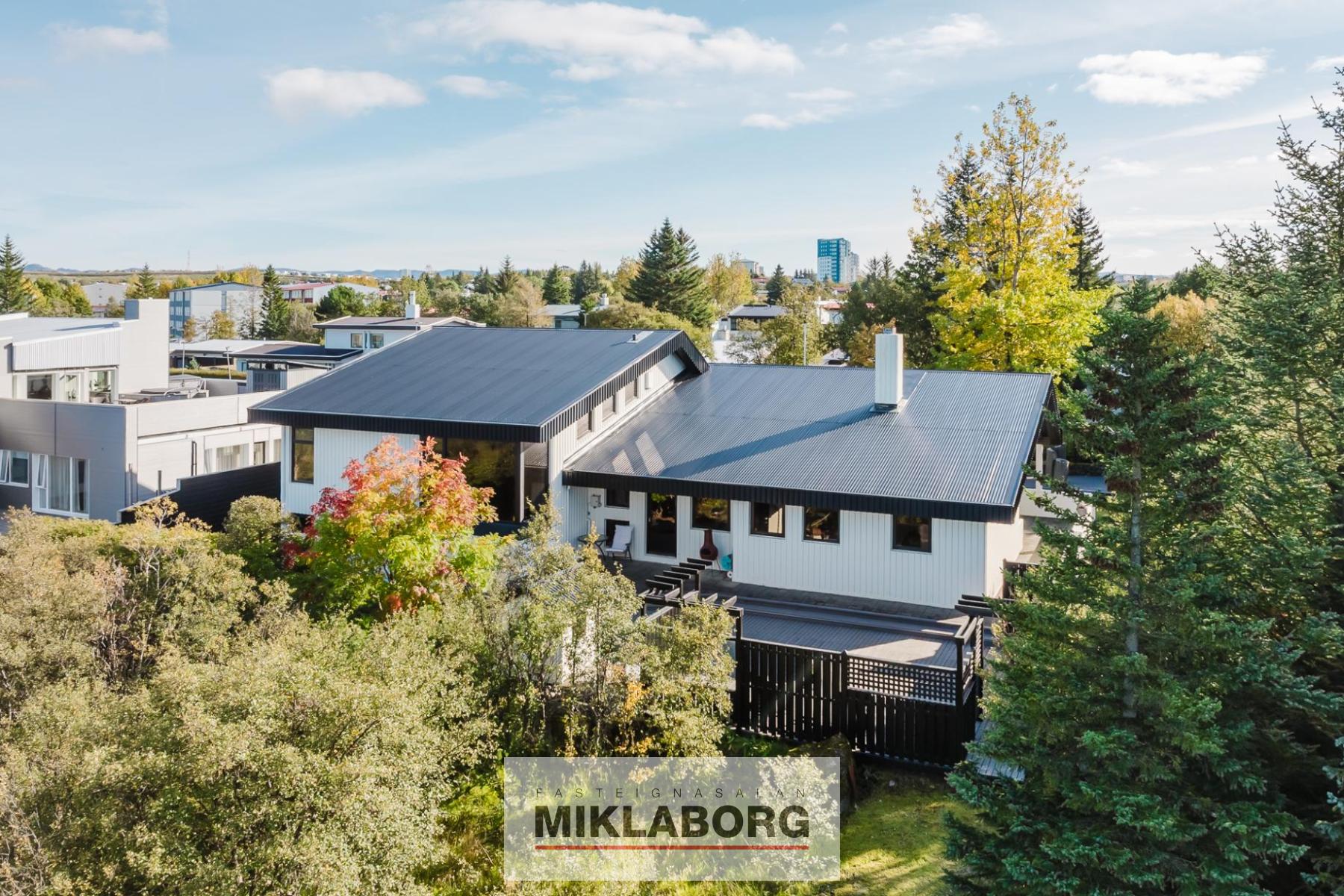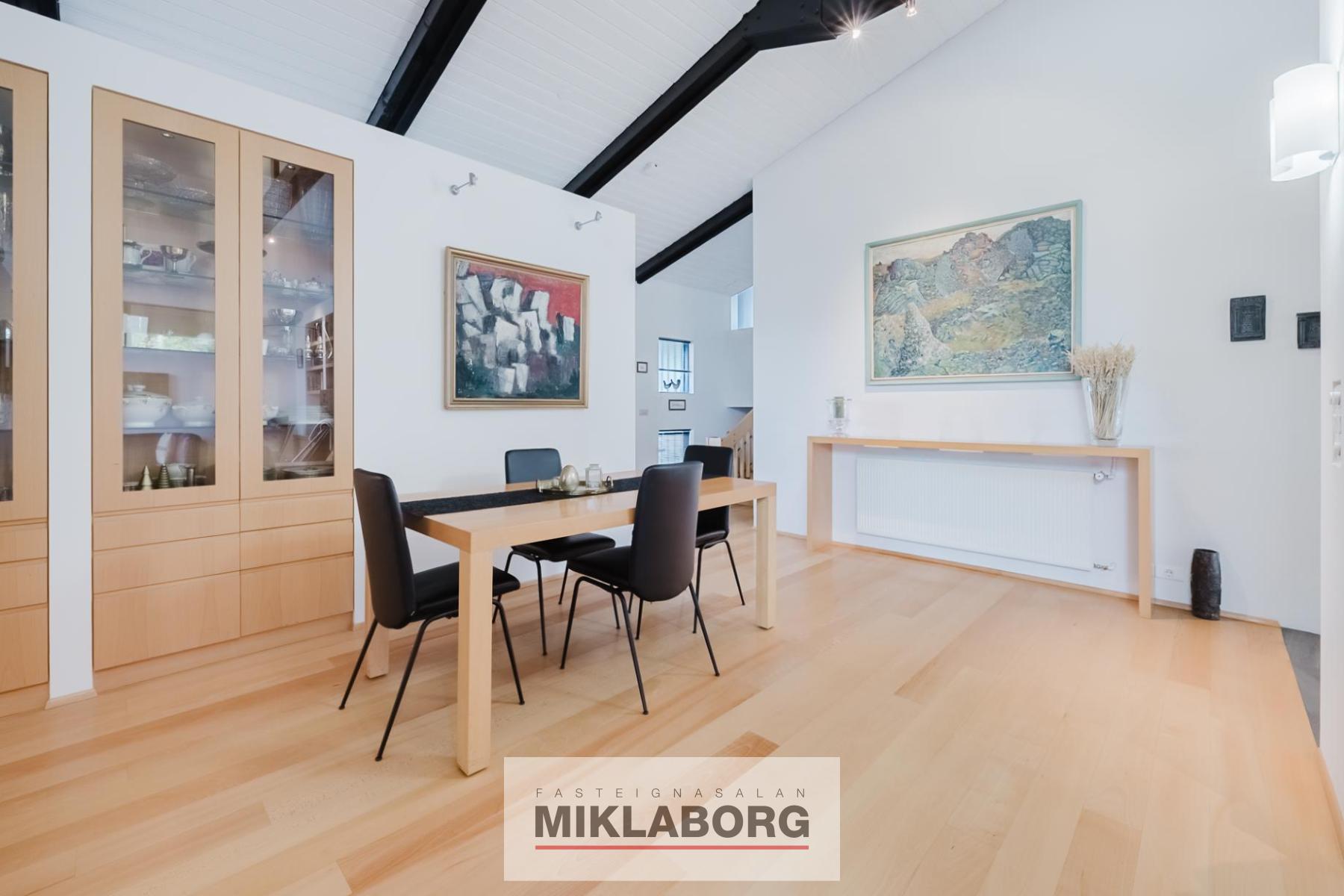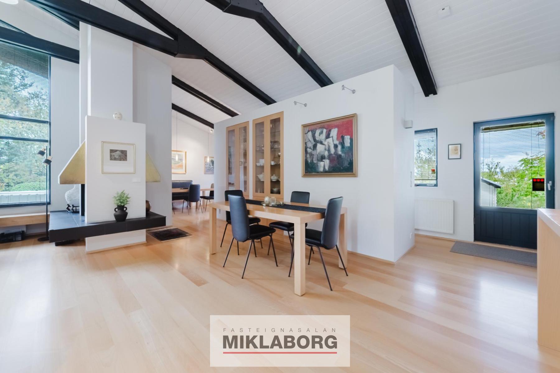 Stofa og eldhús :Úr forstofu er gengið inn í bjarta og rúmgóða stofu með mikilli lofthæð. Þar er arinn og parket á gólfum. Stofan tengist borðstofu í opnu rými og þaðan er gengið inn í eldhús. Þar er parket á gólfi, keramikhelluborð, ofn í vinnuhæð og gott búr. Uppþvottavél og ísskápur fylgja. Úr eldhúsi er gengið inn í flísalagt þvottahús með innréttingum og vaski. Rúmgóð gestasnyrting er inn af forstofu. Gagnger endurnýjun á stofu og eldhúsi átti sér stað á árunum 2000-2004 og á forstofu og gestasnyrtingu á árunum 2018-2020. Efri hæð Komið er upp á rúmgóðan pall með stórum glugga og glæsilegu útsýni yfir borgina og Esju. Þar inn af er annars vegar stórt skrifstofu/sjónvarps herbergi og hins vegar hjónaherbergi og annað minna svefnherbergi með rislofti. Ásamt tveimur fataherbergjum er hjónaherbergið u.þ.b. 30 fermetrar. Baðherbergið er flísalagt með hlýlegri spa stemningu, en þar eru sturta og baðkar í sér rými. Neðri hæð Hér eru tvö herbergi sem hvort um sig er um 16 fermetrar auk flísalagðs baðherbergis með walk-in sturtu og sérsmíðuðum innréttingum. Þá hefur bílskúr verið innréttaður sem notalegt líkamsræktarherbergi auk geymslu. Önnur geymsla er einnig á neðri hæð. Öll neðri hæðin var endurnýjuð á árunum 2018-2021 sem m.a. fól í sér nýja skyggða glugga í stað bílskúrshurðar. Garður Lóðin er afar falleg og vel hönnuð, hellulögð að hluta með góðum palli, barnahúsi og gróðursælum garði þar sem álfasteinn prýðir svæðið. Hægt er að njóta bæði morgun- og kvöldsólar í þessu friðsæla umhverfi.Þetta er einstaklega hlýlegt og vandað heimili á einum af bestu stöðunum í Seljahverfi eða á höfuðborgarsvæðinu ef út í það yrði farið.
