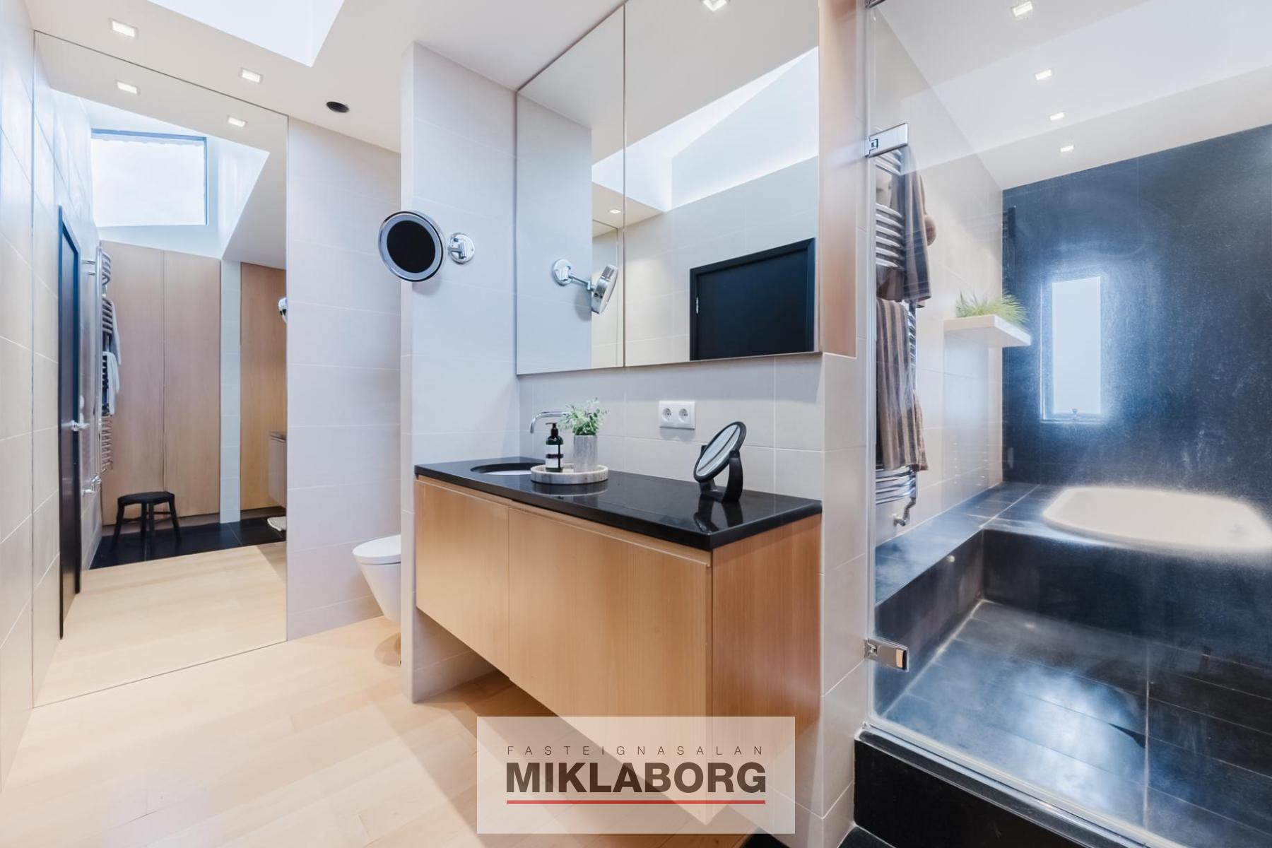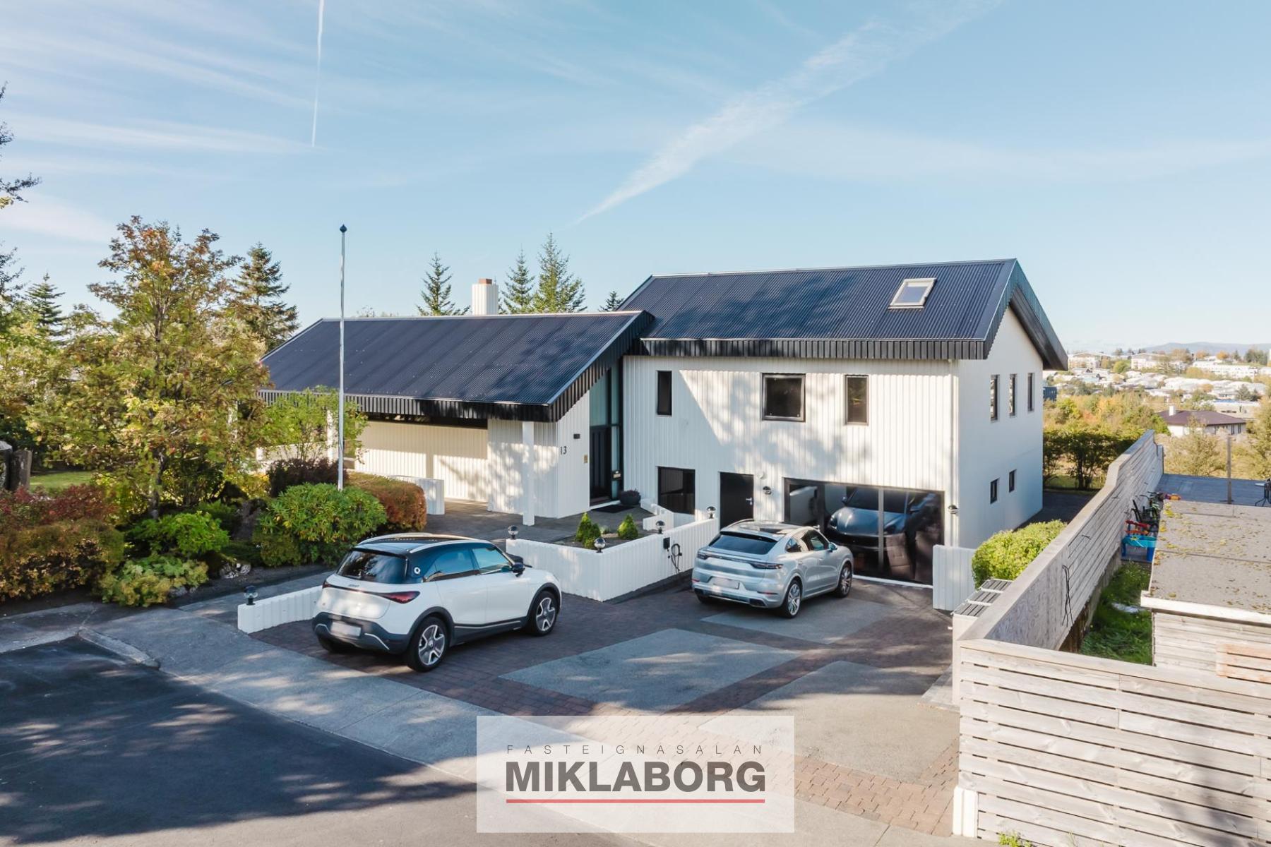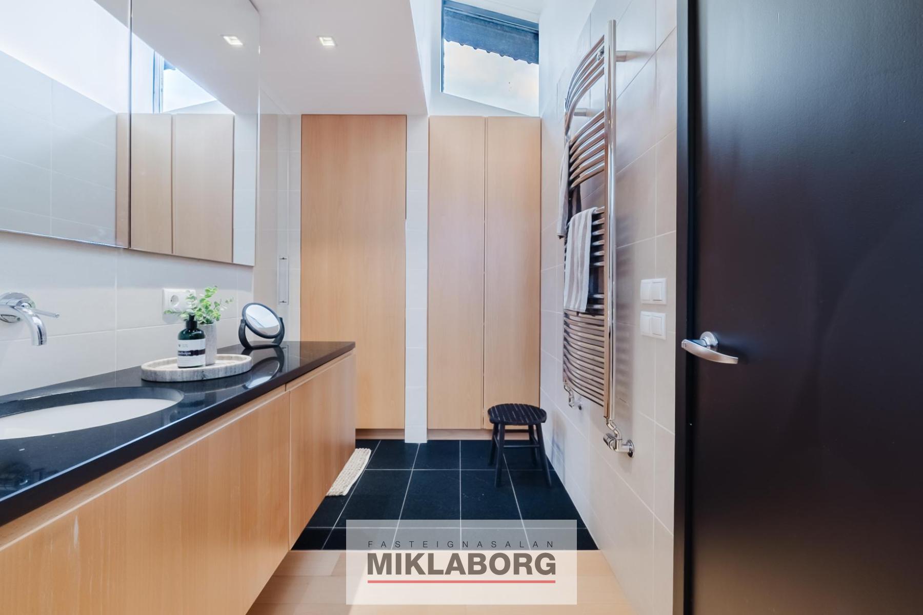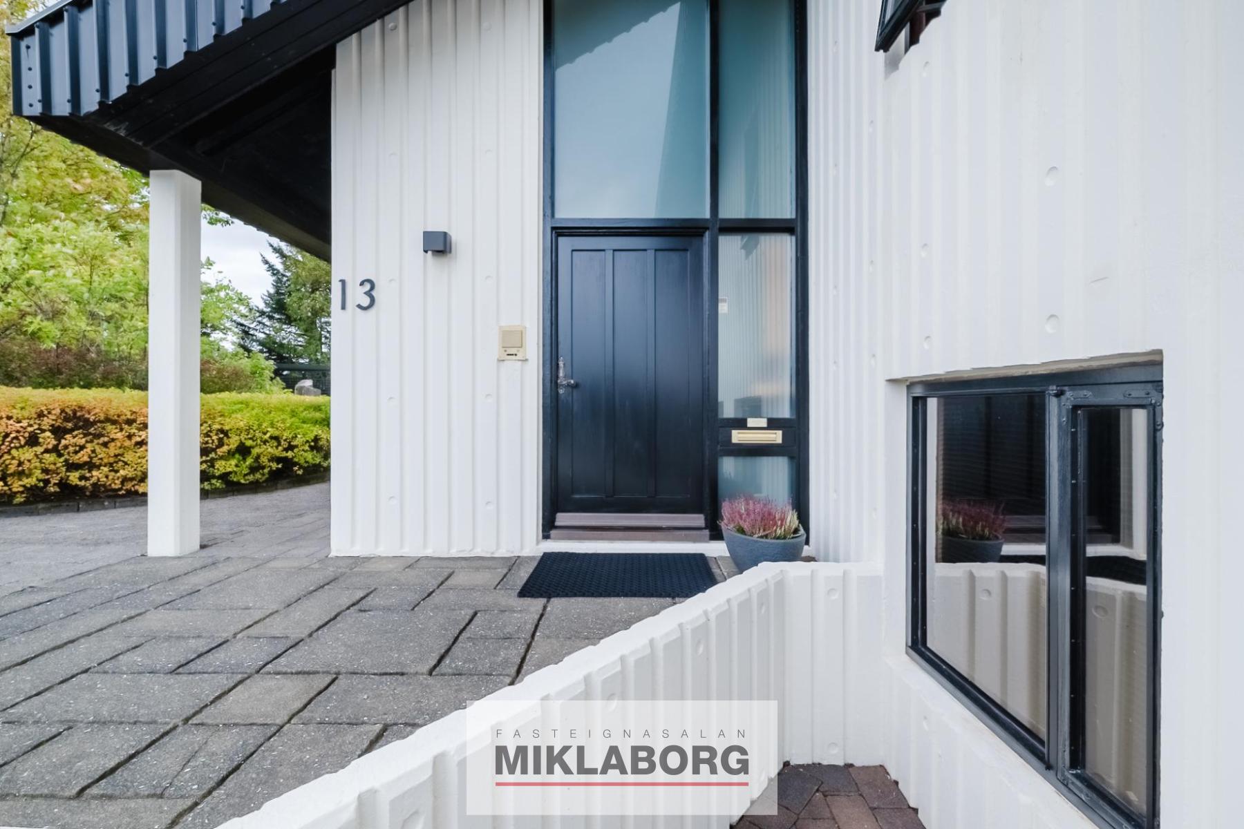 Stofa og eldhús :Úr forstofu er gengið inn í bjarta og rúmgóða stofu með mikilli lofthæð. Þar er arinn og parket á gólfum. Stofan tengist borðstofu í opnu rými og þaðan er gengið inn í eldhús. Þar er parket á gólfi, keramikhelluborð, ofn í vinnuhæð og gott búr. Uppþvottavél og ísskápur fylgja. Úr eldhúsi er gengið inn í flísalagt þvottahús með innréttingum og vaski. Rúmgóð gestasnyrting er inn af forstofu. Gagnger endurnýjun á stofu og eldhúsi átti sér stað á árunum 2000-2004 og á forstofu og gestasnyrtingu á árunum 2018-2020. Efri hæð Komið er upp á rúmgóðan pall með stórum glugga og glæsilegu útsýni yfir borgina og Esju. Þar inn af er annars vegar stórt skrifstofu/sjónvarps herbergi og hins vegar hjónaherbergi og annað minna svefnherbergi með rislofti. Ásamt tveimur fataherbergjum er hjónaherbergið u.þ.b. 30 fermetrar. Baðherbergið er flísalagt með hlýlegri spa stemningu, en þar eru sturta og baðkar í sér rými. Neðri hæð Hér eru tvö herbergi sem hvort um sig er um 16 fermetrar auk flísalagðs baðherbergis með walk-in sturtu og sérsmíðuðum innréttingum. Þá hefur bílskúr verið innréttaður sem notalegt líkamsræktarherbergi auk geymslu. Önnur geymsla er einnig á neðri hæð. Öll neðri hæðin var endurnýjuð á árunum 2018-2021 sem m.a. fól í sér nýja skyggða glugga í stað bílskúrshurðar. Garður Lóðin er afar falleg og vel hönnuð, hellulögð að hluta með góðum palli, barnahúsi og gróðursælum garði þar sem álfasteinn prýðir svæðið. Hægt er að njóta bæði morgun- og kvöldsólar í þessu friðsæla umhverfi.Þetta er einstaklega hlýlegt og vandað heimili á einum af bestu stöðunum í Seljahverfi eða á höfuðborgarsvæðinu ef út í það yrði farið.