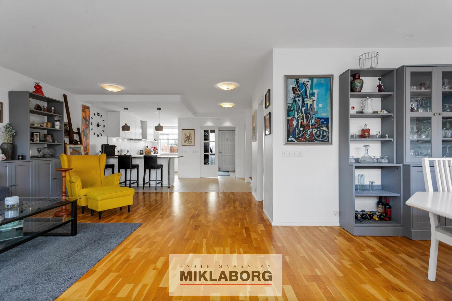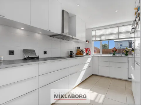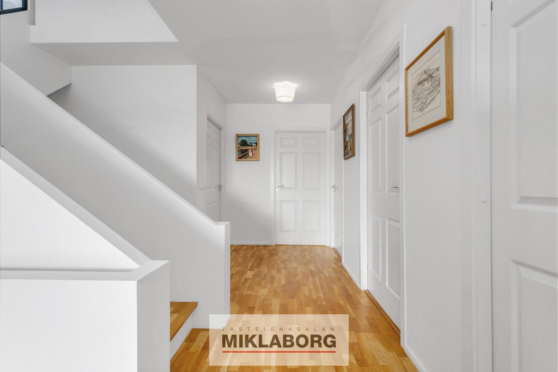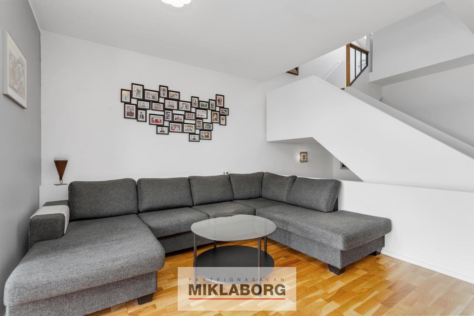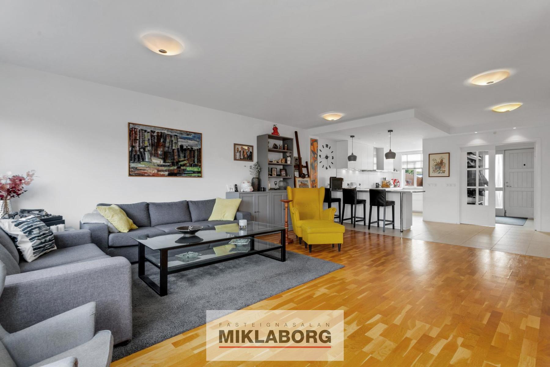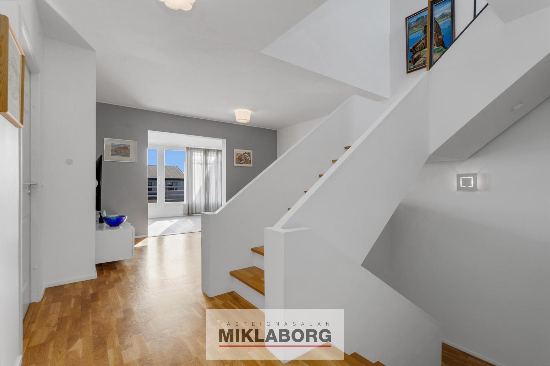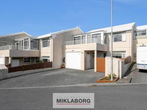 Miklaborg kynnir: Raðhús á tveimur hæðum með innbyggðum bílskúr Á neðri hæðinni er forstofa, eldhús, baðherbergi og stofa. Á efri hæðinni eru 4 svefnherbergi, sólstofa og baðherbergi auk herbergis í innréttuðu risi.