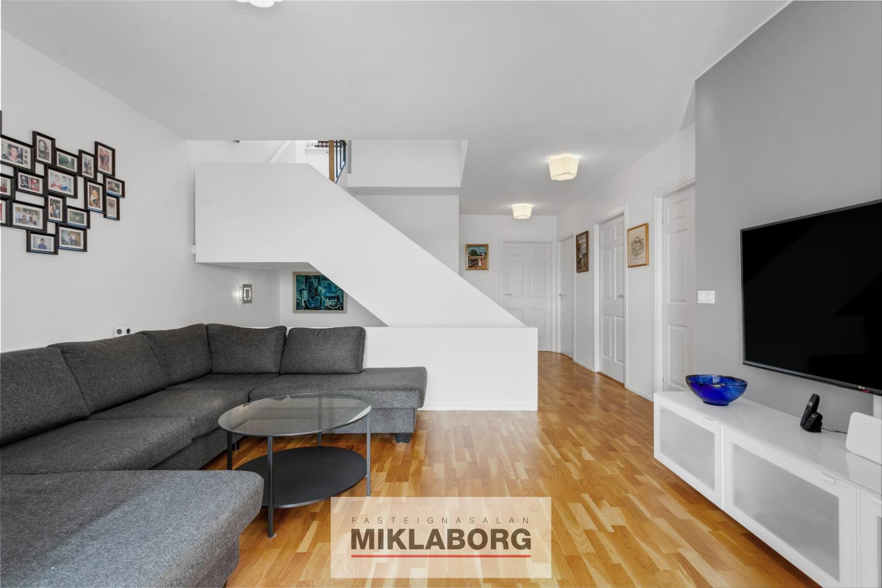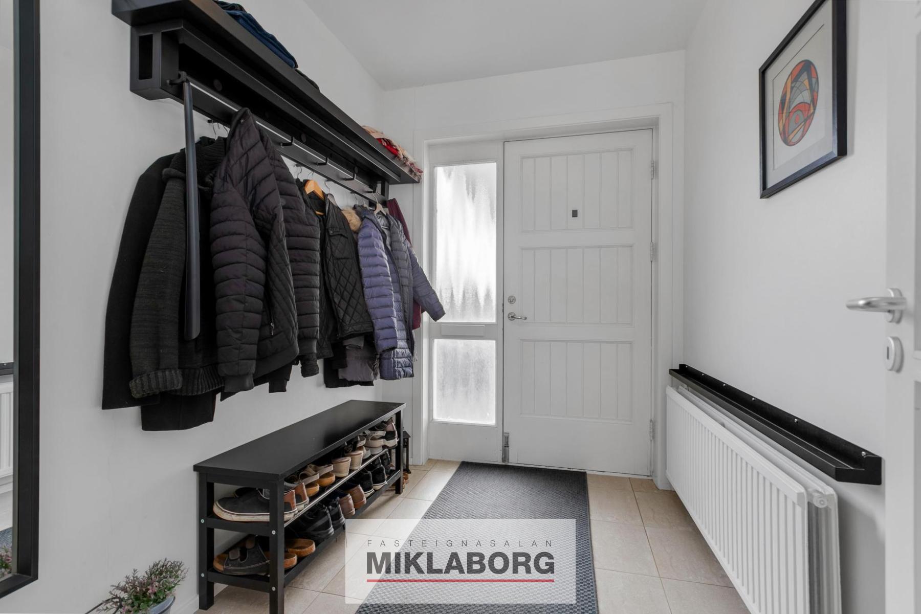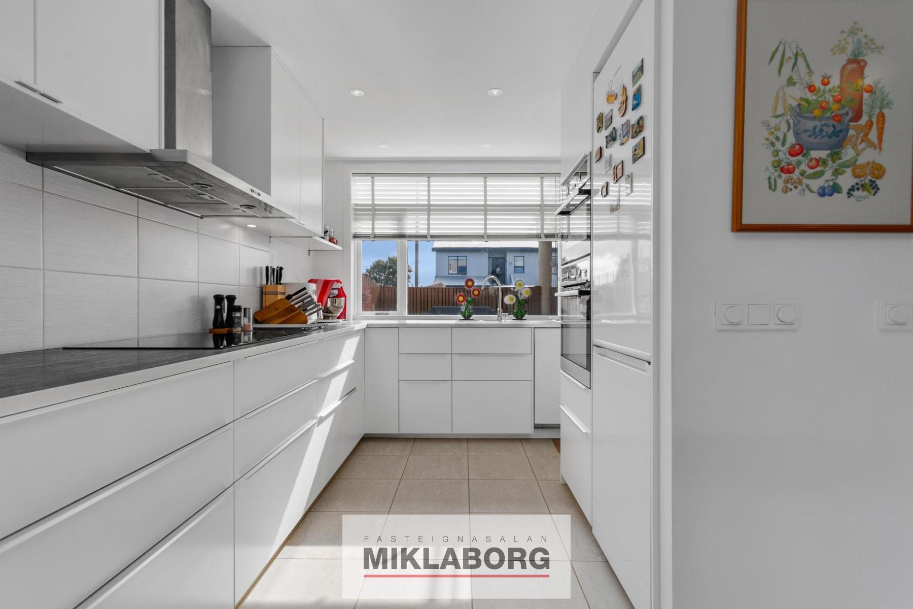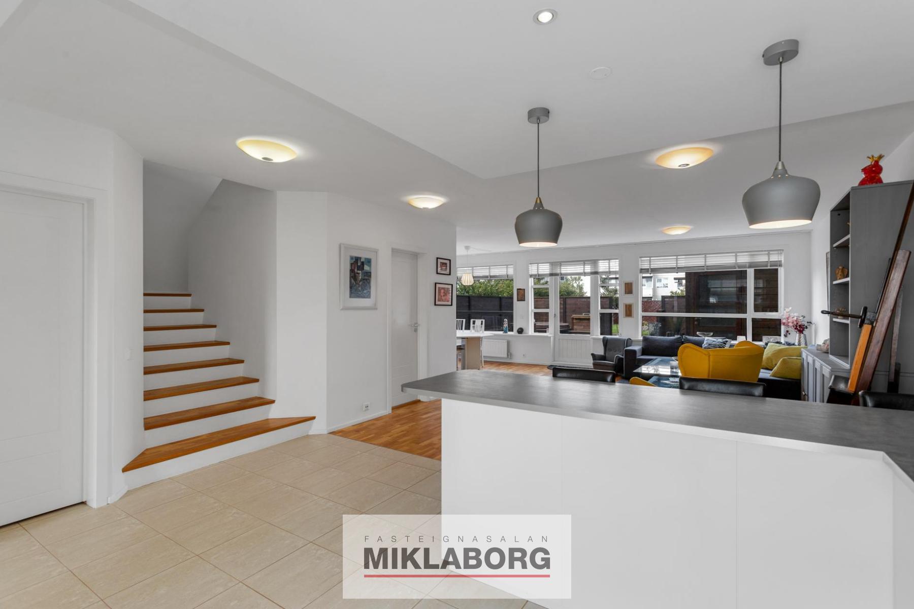 Miklaborg kynnir: Raðhús á tveimur hæðum með innbyggðum bílskúr Á neðri hæðinni er forstofa, eldhús, baðherbergi og stofa. Á efri hæðinni eru 4 svefnherbergi, sólstofa og baðherbergi auk herbergis í innréttuðu risi.