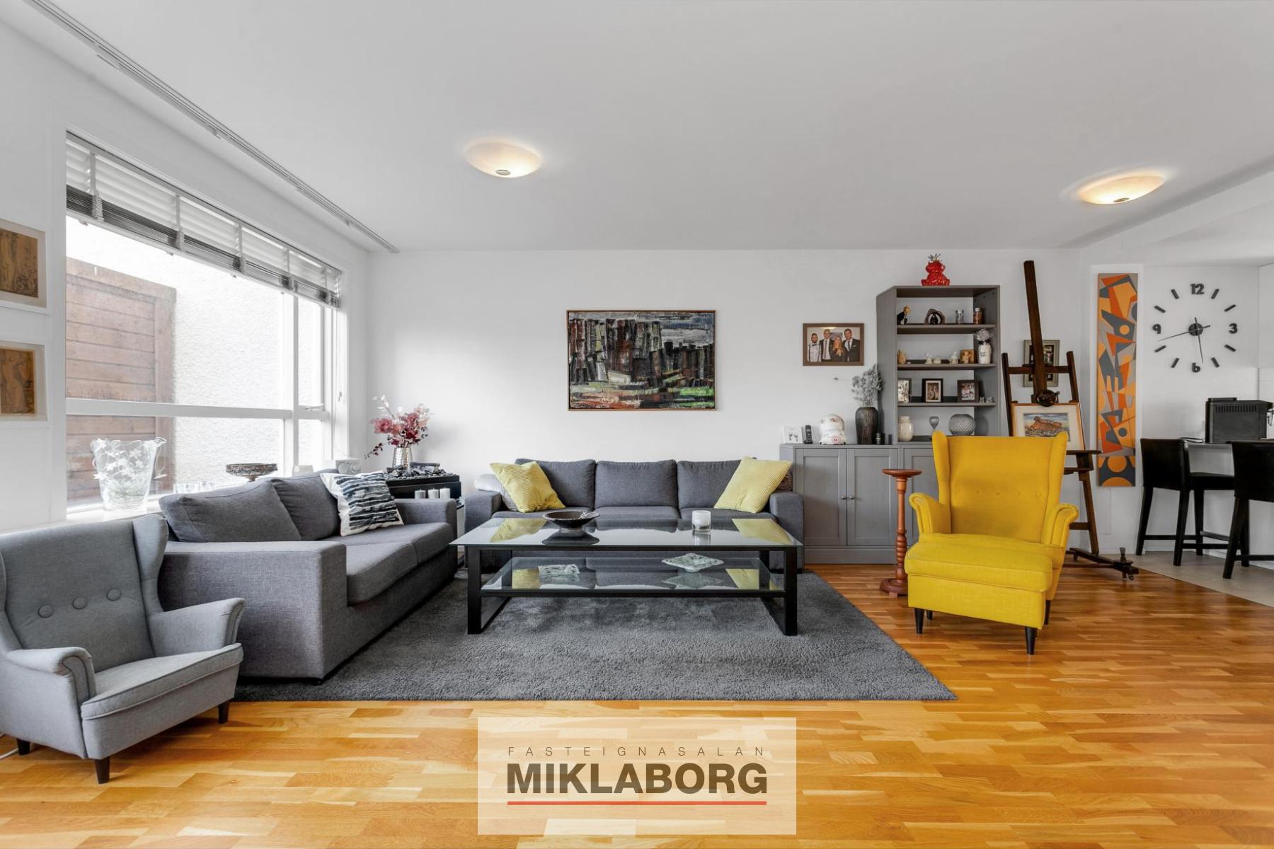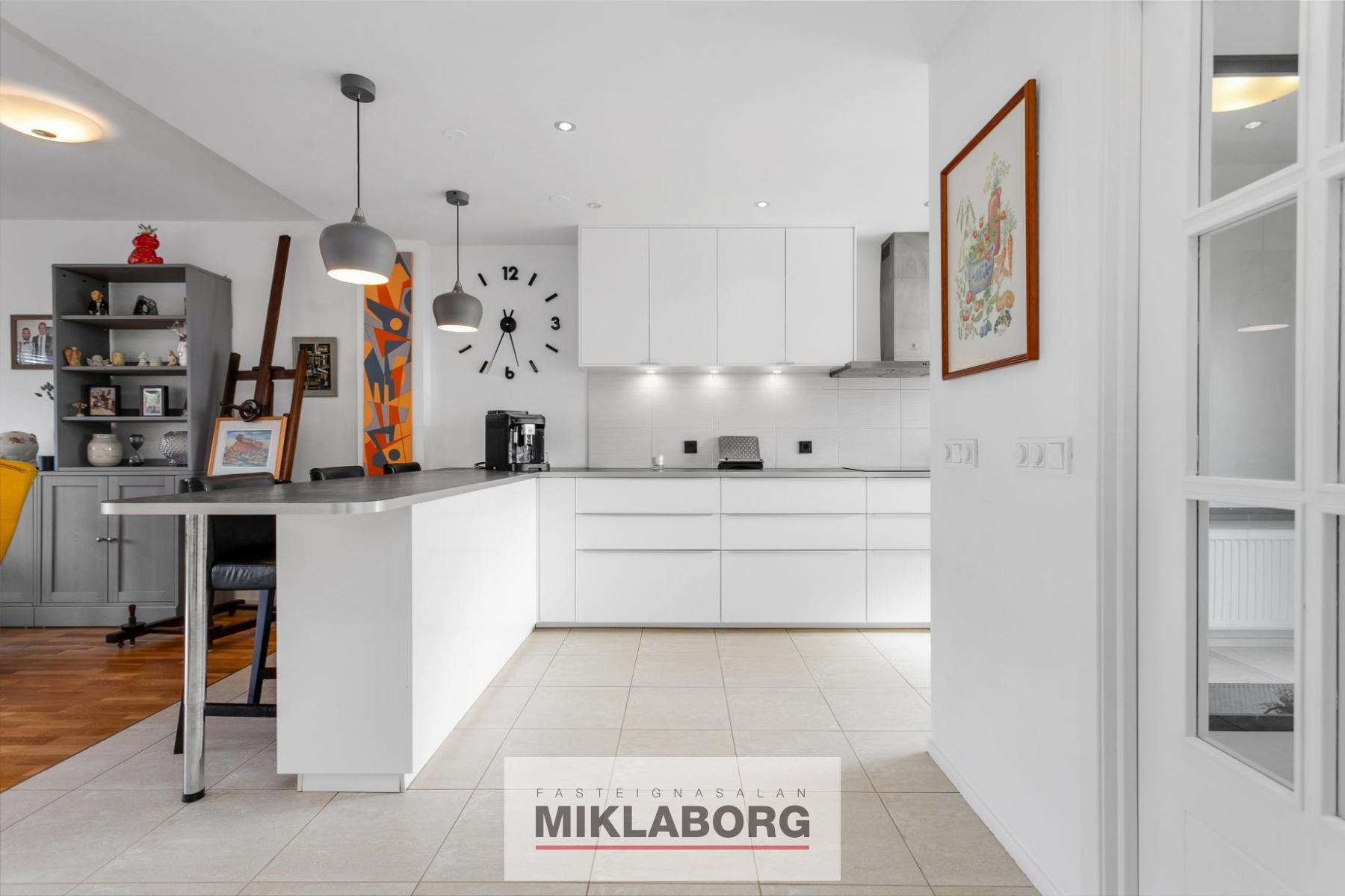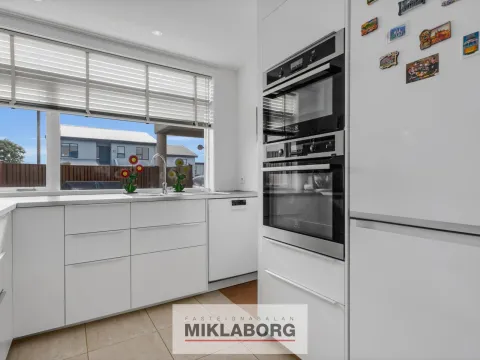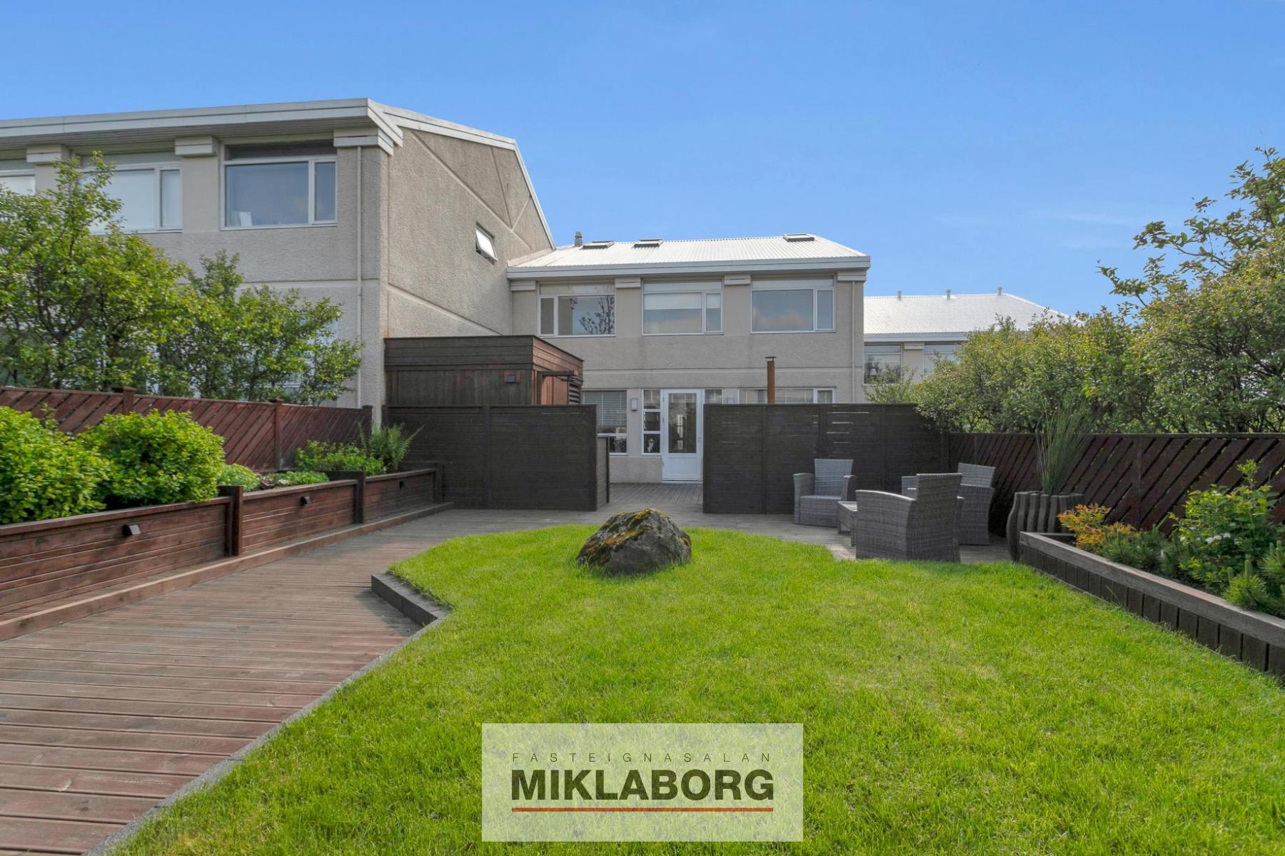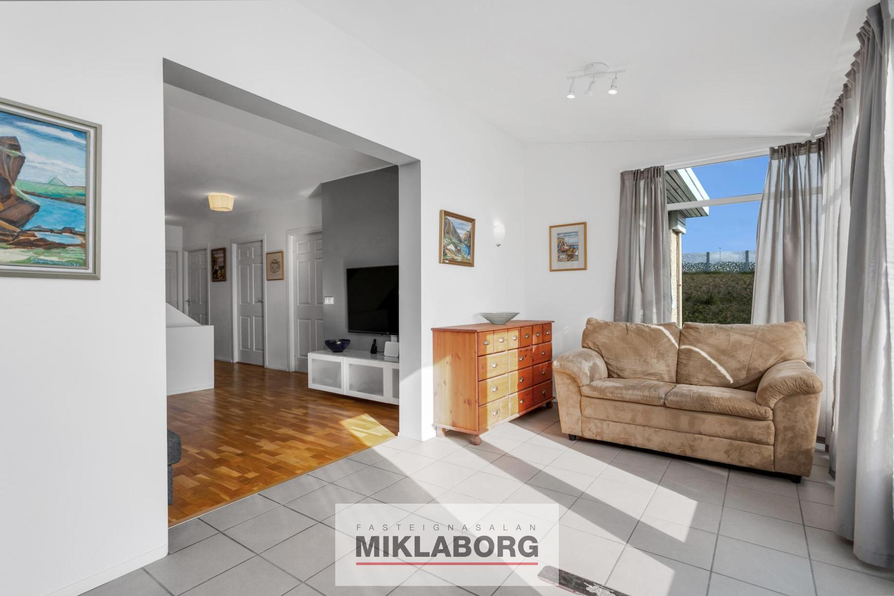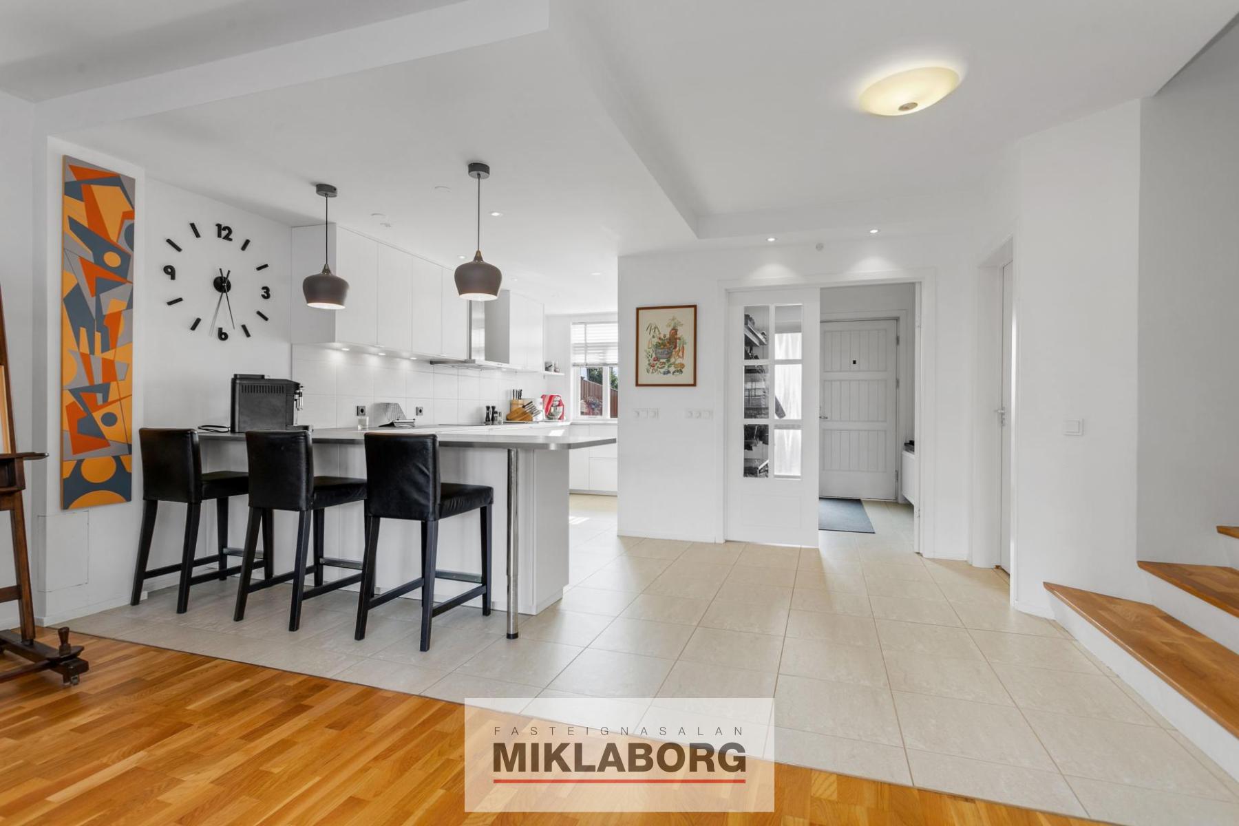Miklaborg kynnir: Raðhús á tveimur hæðum með innbyggðum bílskúr Á neðri hæðinni er forstofa, eldhús, baðherbergi og stofa. Á efri hæðinni eru 4 svefnherbergi, sólstofa og baðherbergi auk herbergis í innréttuðu risi.