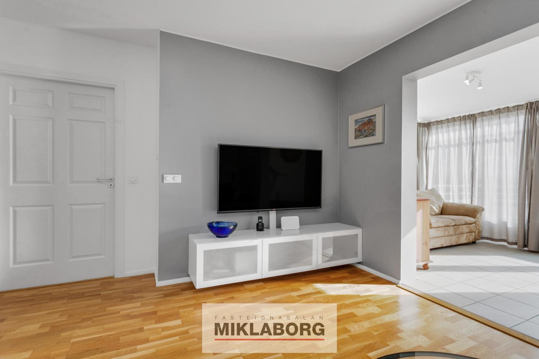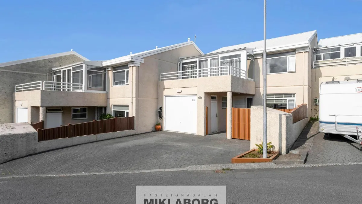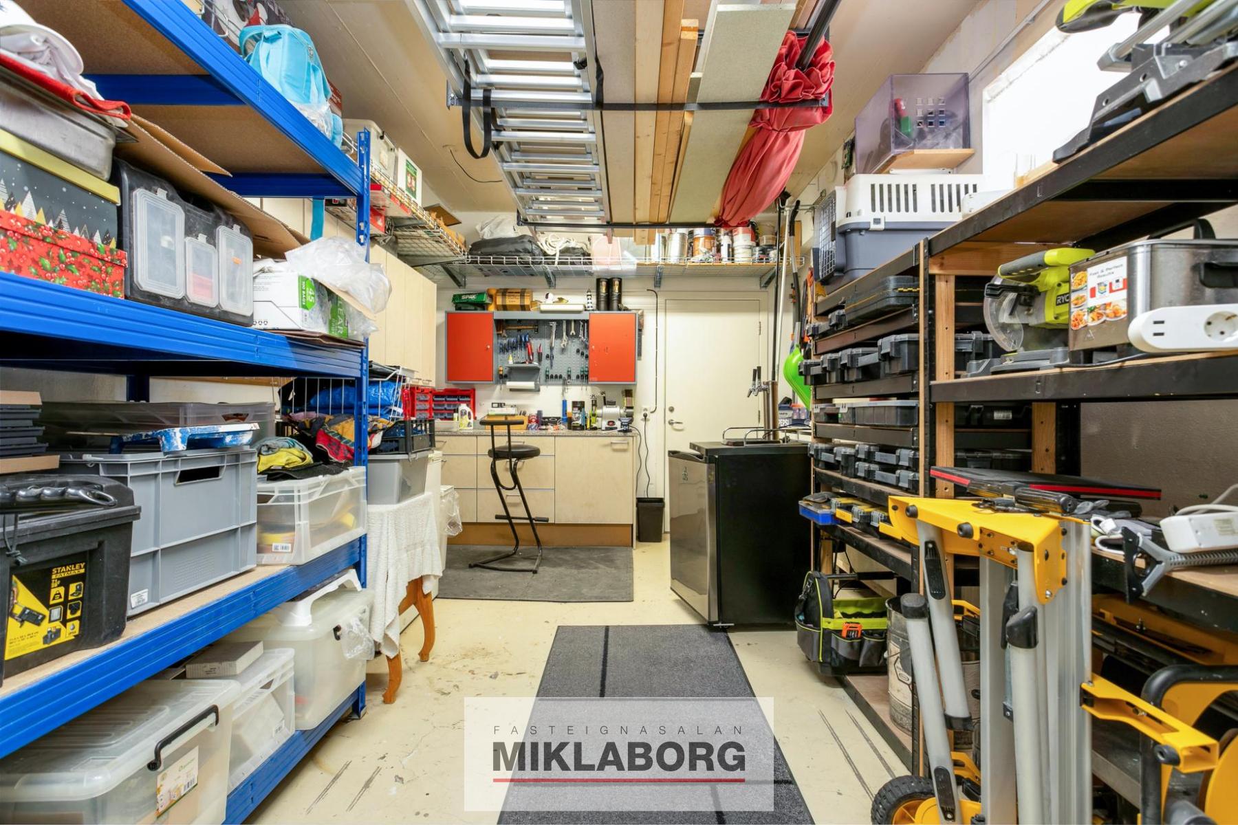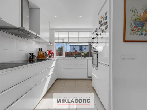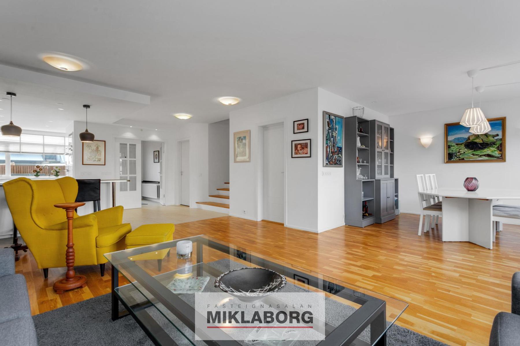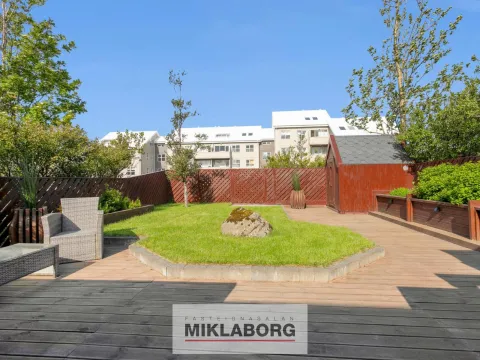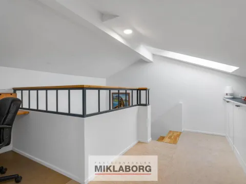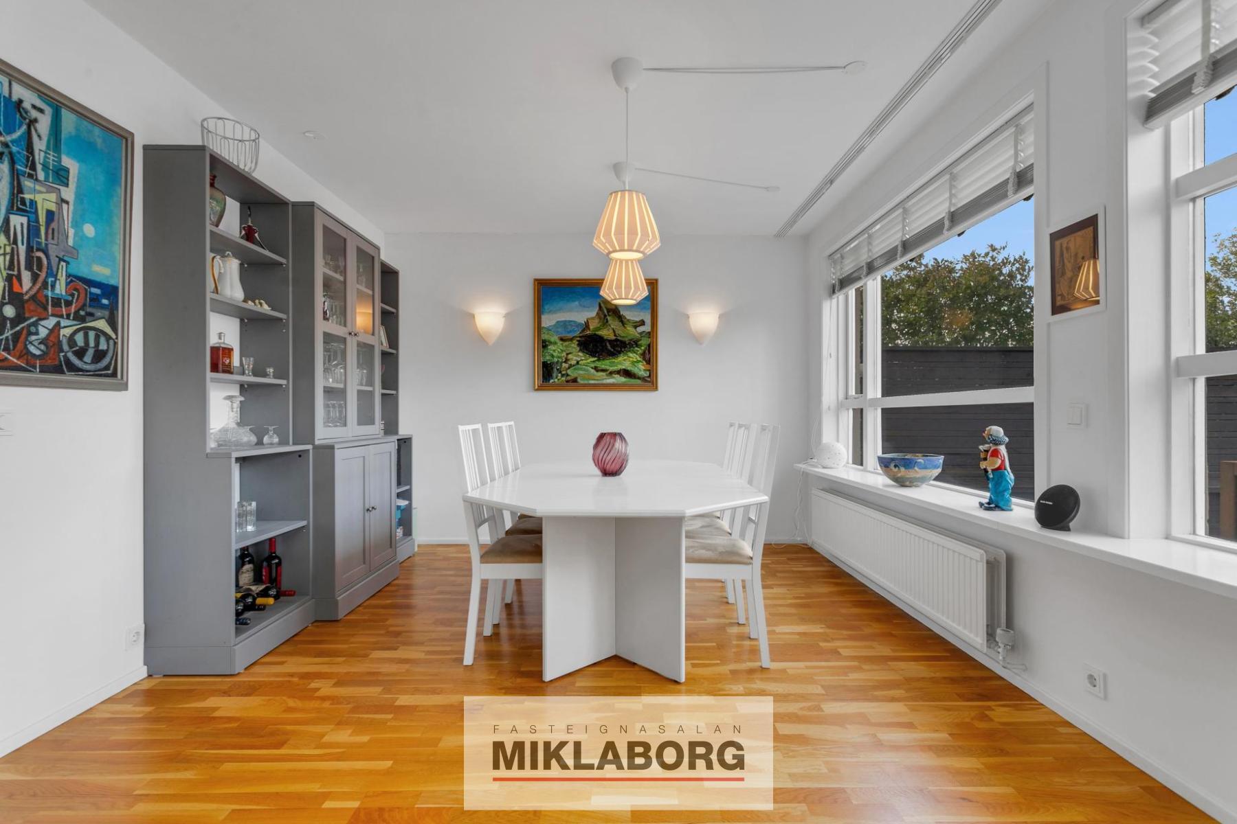 Miklaborg kynnir: Raðhús á tveimur hæðum með innbyggðum bílskúr Á neðri hæðinni er forstofa, eldhús, baðherbergi og stofa. Á efri hæðinni eru 4 svefnherbergi, sólstofa og baðherbergi auk herbergis í innréttuðu risi.